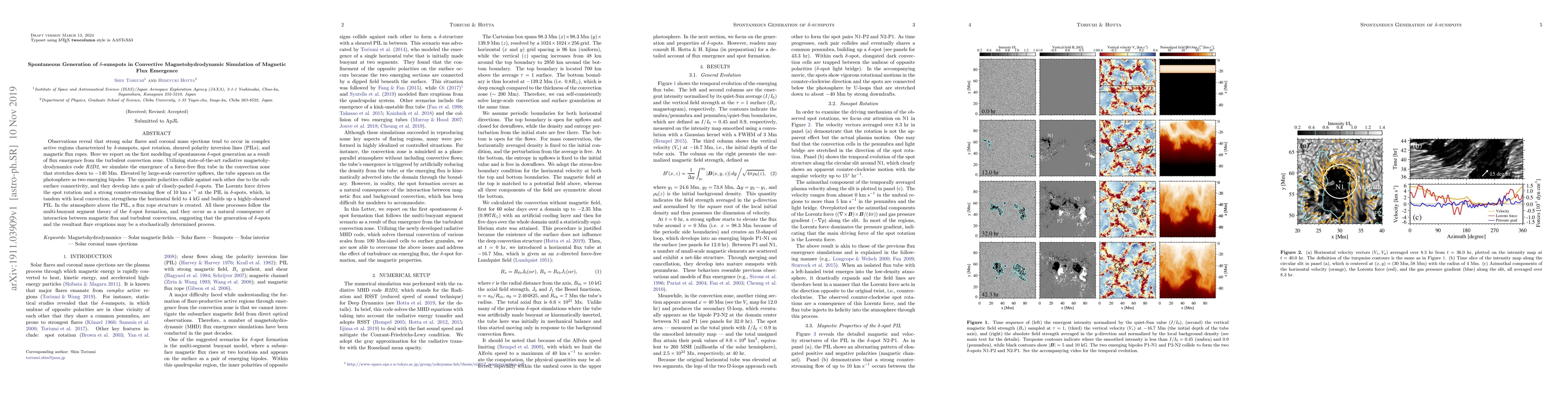 This study uses advanced magnetohydrodynamic simulations to model the spontaneous emergence of delta-sunspots from magnetic flux rising through turbulent convection. The simulation reveals that delta-spots form through the collision of opposite polarities driven by subsurface connectivity, resulting in strong magnetic fields and flux rope structures, suggesting a stochastic nature of delta-spot generation and associated solar flare eruptions.