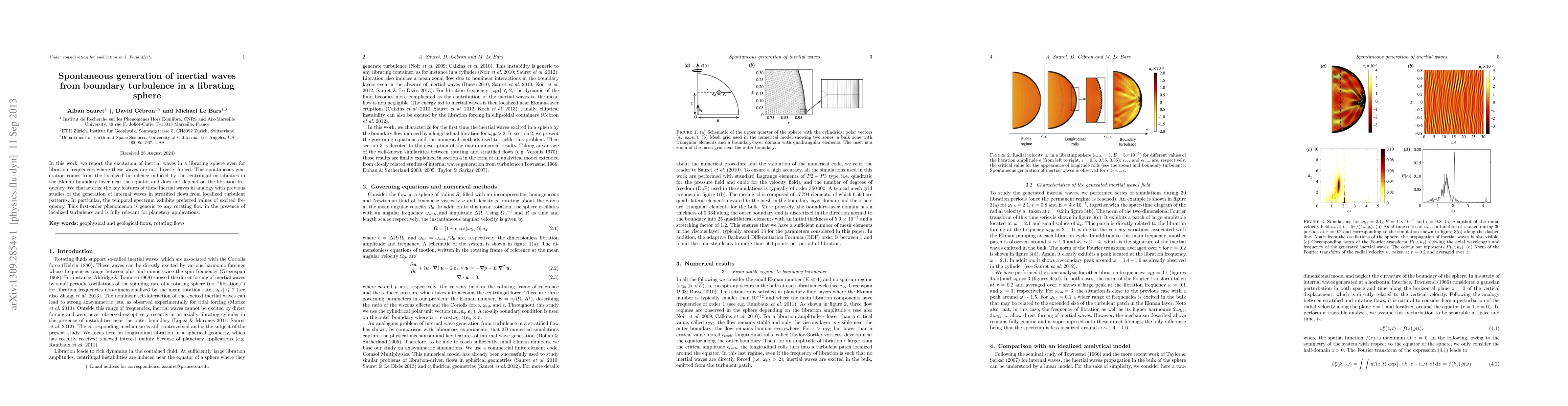This study reveals the spontaneous generation of inertial waves from boundary turbulence in a librating sphere, driven by centrifugal instabilities in the Ekman layer. These inertial waves occur even at libration frequencies where they are not directly forced, highlighting a generic phenomenon applicable to planetary dynamics.