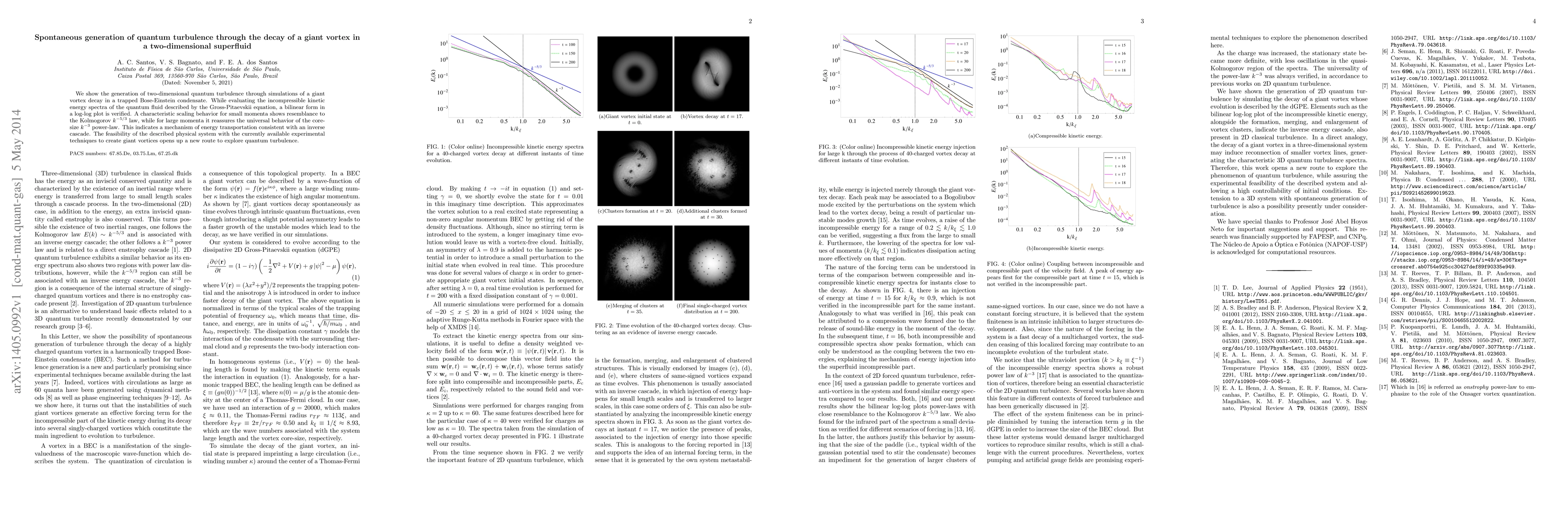 This paper demonstrates the spontaneous generation of quantum turbulence via the decay of a giant vortex in a two-dimensional superfluid, using simulations of a Bose-Einstein condensate. The study reveals a scaling behavior in the kinetic energy spectra that aligns with both Kolmogorov's $k^{-5/3}$ law and the core-size $k^{-3}$ power-law, indicating an inverse cascade mechanism.