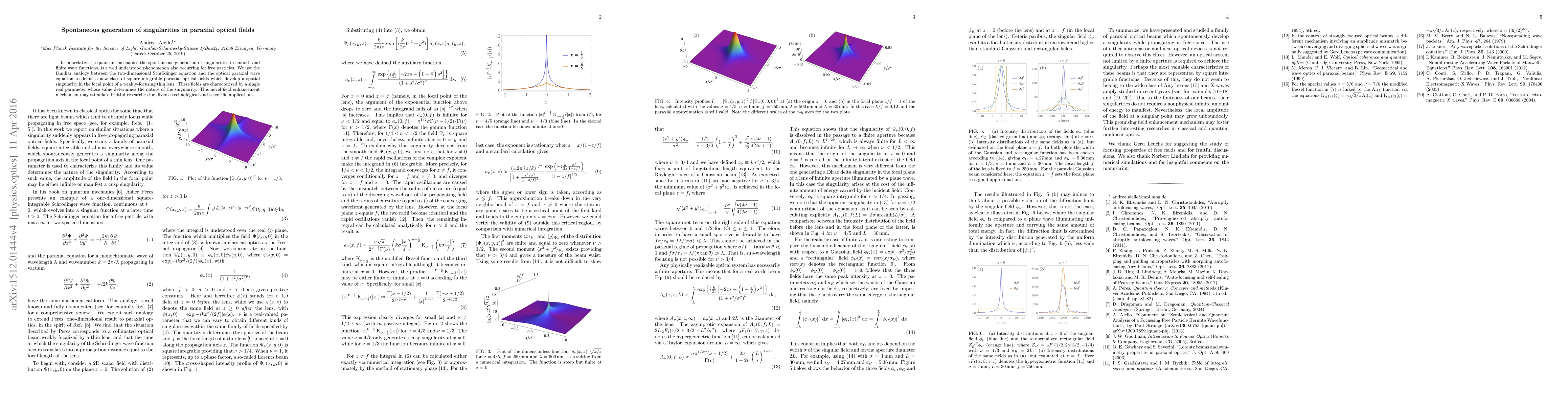 This paper explores the spontaneous generation of singularities in paraxial optical fields, drawing an analogy between the two-dimensional Schrödinger equation and the optical paraxial wave equation. It introduces a new class of fields that develop spatial singularities at the focal point, potentially opening avenues for technological and scientific advancements.