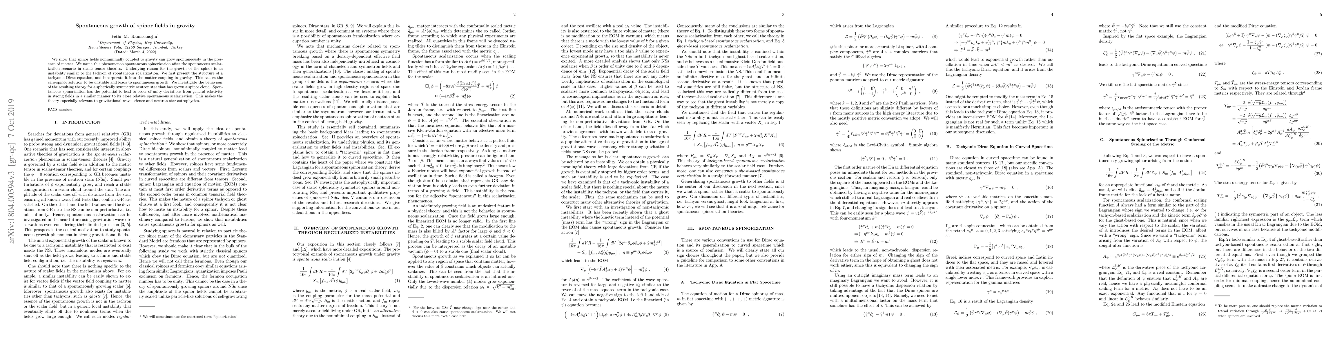 This paper demonstrates that spinor fields, when nonminimally coupled to gravity, can spontaneously grow due to an instability akin to the tachyon effect in scalar-tensor theories. This phenomenon, termed spontaneous spinorization, could lead to significant deviations from general relativity in strong gravitational fields, impacting gravitational wave science and neutron star astrophysics.