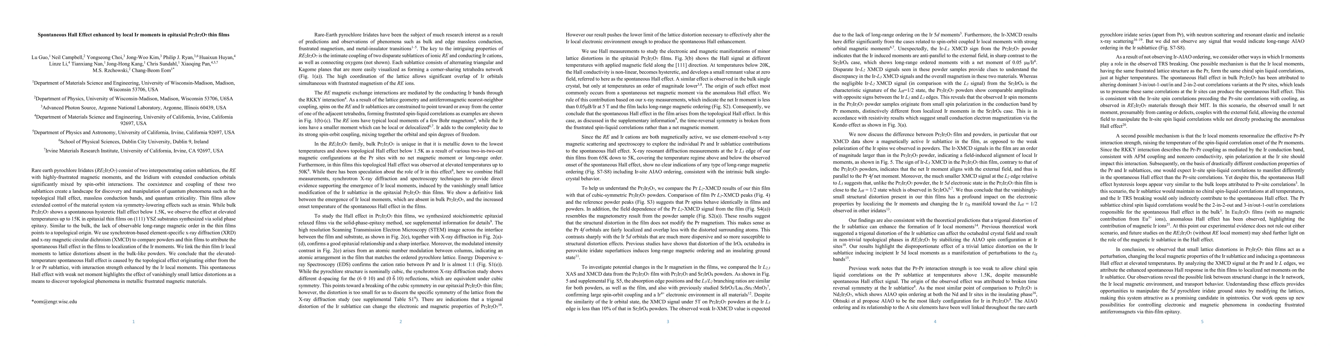 The research presents that thin films of Pr2Ir2O7 exhibit a spontaneous hysteretic Hall effect at elevated temperatures (up to 15K) compared to bulk's 1.5K, attributed to localized Ir moments influenced by lattice distortions. Element-specific x-ray techniques reveal this topological origin, suggesting small lattice distortions can unveil topological phenomena in magnetic materials.