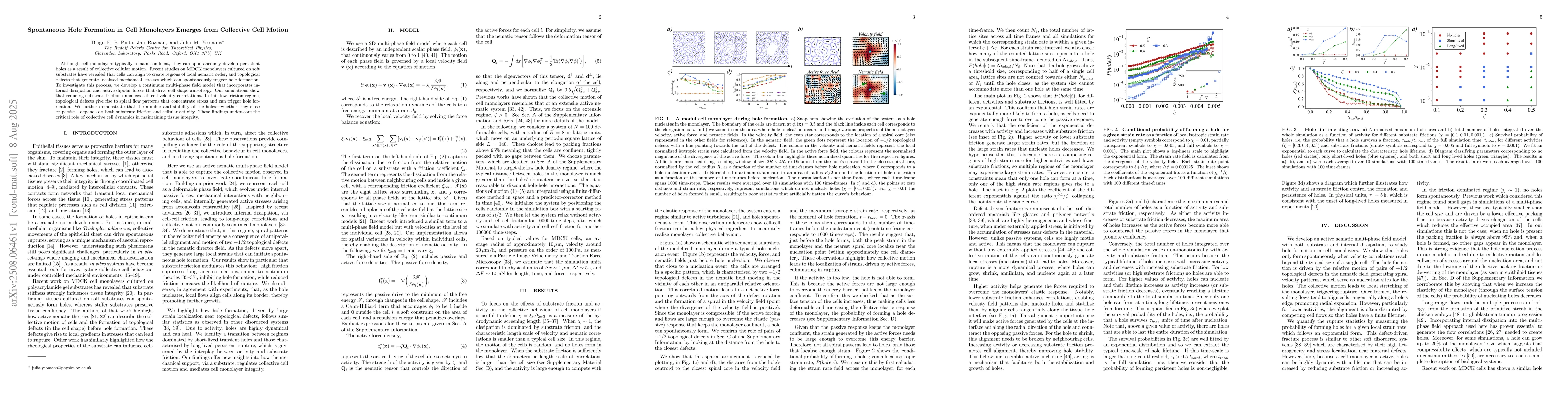 Although cell monolayers typically remain confluent, they can spontaneously develop persistent holes as a result of collective cellular motion. Recent studies on MDCK monolayers cultured on soft substrates have revealed that cells can align to create regions of local nematic order, and topological defects that generate localised mechanical stresses which can spontaneously trigger hole formation. To investigate this process, we develop a continuum multi-phase field model that incorporates internal dissipation and active dipolar forces that drive cell shape anisotropy. Our simulations show that reducing substrate friction enhances cell-cell velocity correlations. In this low-friction regime, topological defects give rise to spiral flow patterns that concentrate stress and can trigger hole formation. We further demonstrate that the number and stability of the holes, whether they close or persist, depends on both substrate friction and cellular activity. These findings underscore the critical role of collective cell dynamics in maintaining tissue integrity.