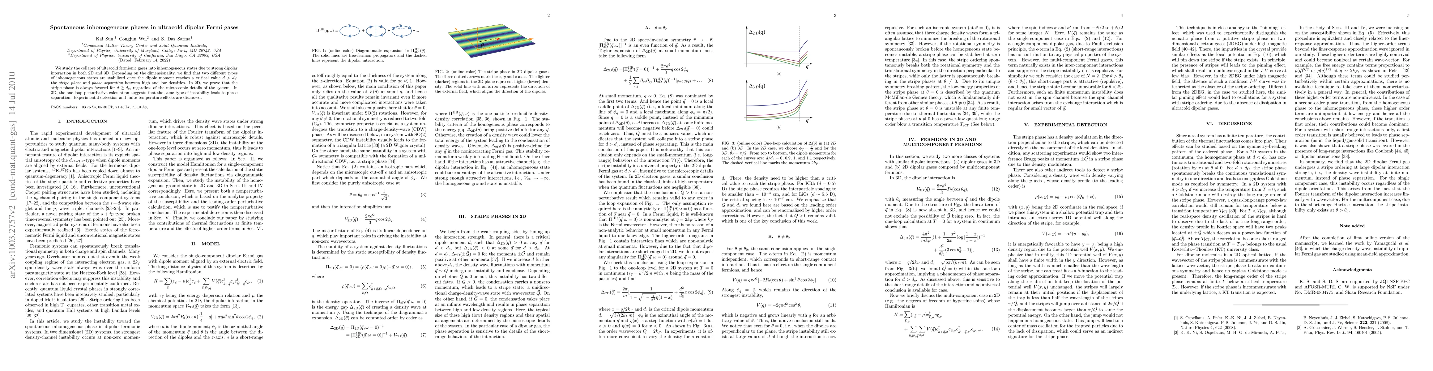 This paper investigates the collapse of ultracold dipolar Fermi gases into inhomogeneous phases due to strong dipolar interactions. In 2D, the system favors a stripe phase, while in 3D, phase separation is favored, with both phenomena occurring above a critical dipole moment threshold.