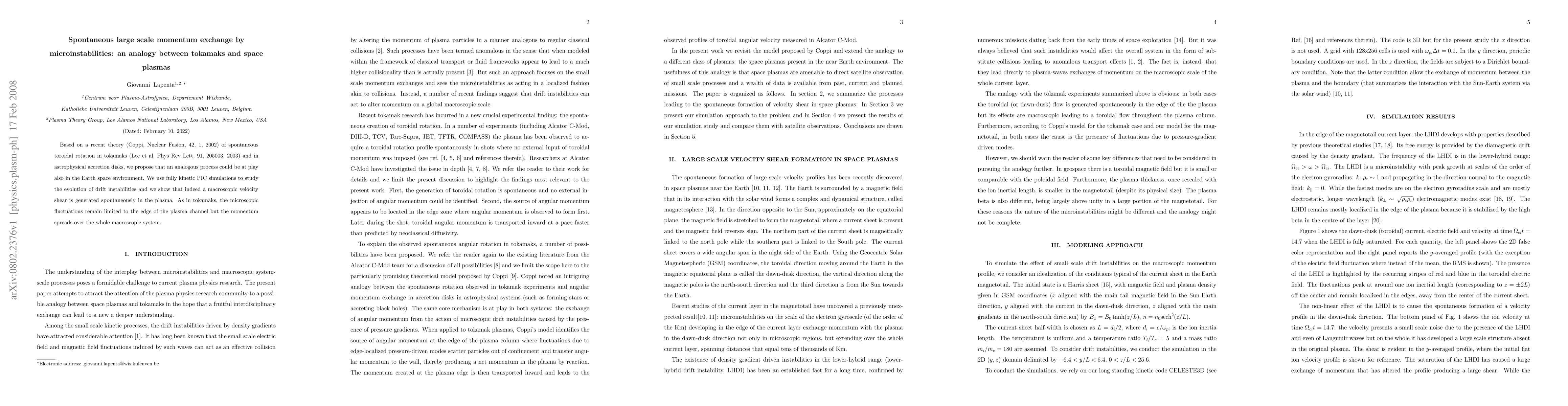 This paper proposes a theory of spontaneous large-scale momentum exchange in space plasmas, analogous to toroidal rotation in tokamaks, using kinetic PIC simulations to demonstrate the generation of macroscopic velocity shear from drift instabilities. The microscopic fluctuations remain localized, yet the momentum spreads throughout the entire system.