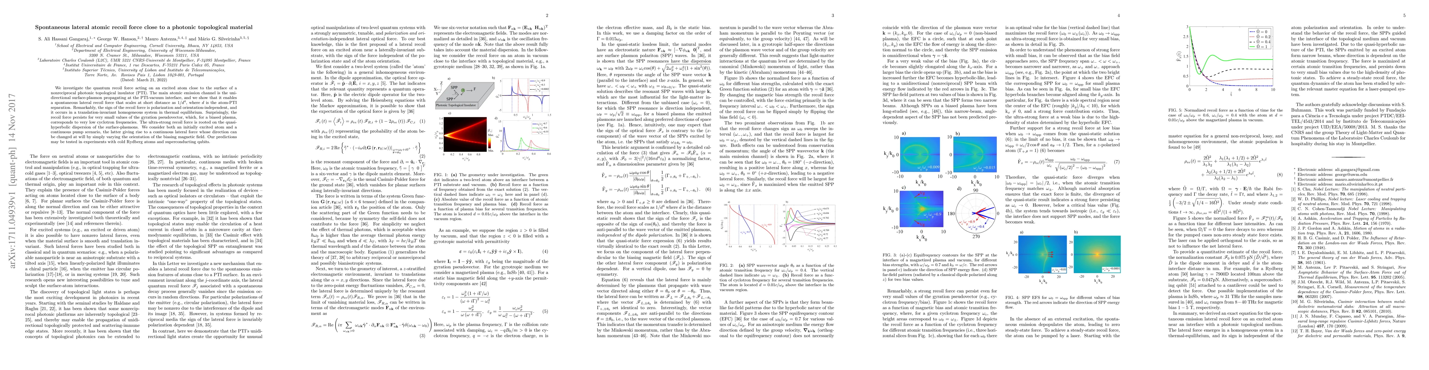 Researchers discovered a spontaneous lateral recoil force acting on an excited atom near a nonreciprocal photonic topological insulator, which scales as 1/d^4 and persists even at low cyclotron frequencies.