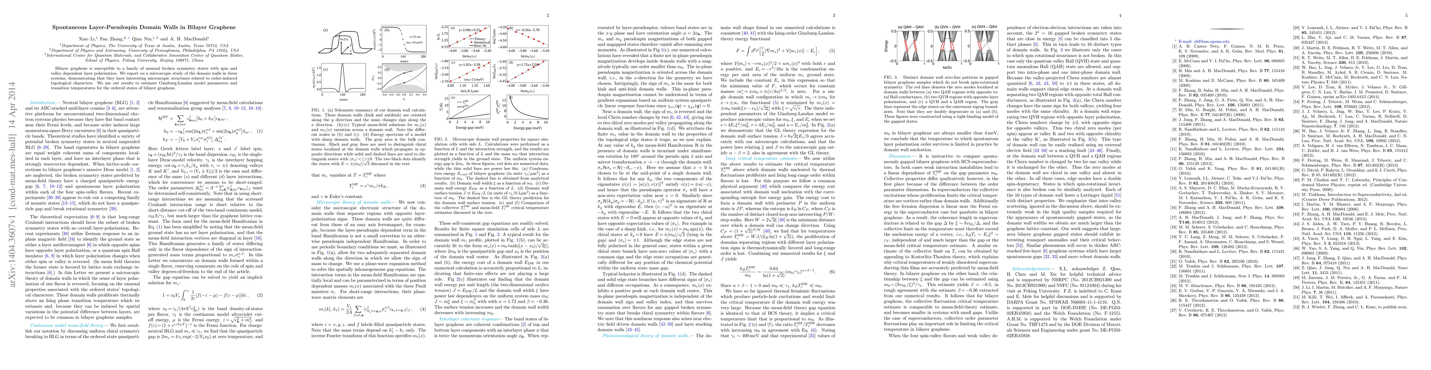 Bilayer graphene exhibits unique broken symmetry states with spin and valley dependent layer polarization, featuring domain walls with topological characters. The study estimates Ginzburg-Landau model parameters and transition temperatures for these ordered states.