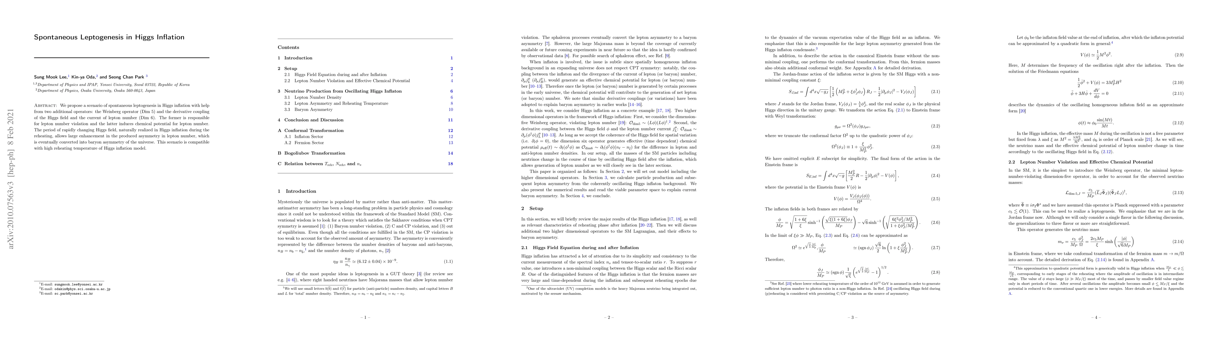 This paper proposes a scenario of spontaneous leptogenesis during Higgs inflation, utilizing the Weinberg operator for lepton number violation and a derivative coupling for lepton number chemical potential, leading to a large enhancement in lepton asymmetry that converts into baryon asymmetry, compatible with high reheating temperatures.