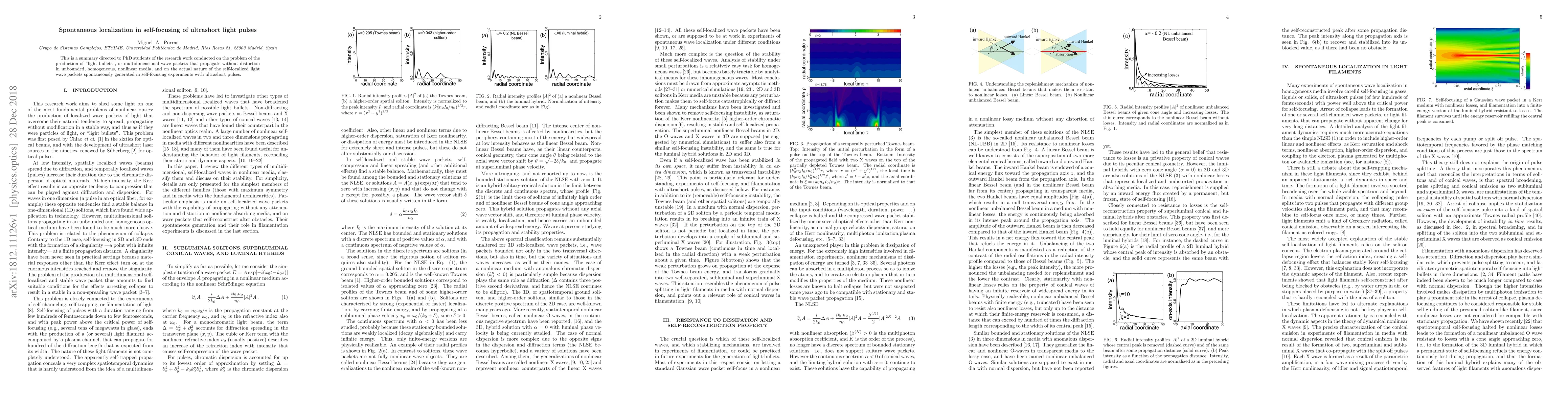 This is a summary directed to PhD students of the research work conducted on the problem of the production of "light bullets", or multidimensional wave packets that propagate without distortion in unbounded, homogeneous, nonlinear media, and on the actual nature of the self-localized light wave packets spontaneously generated in self-focusing experiments with ultrashort pulses.