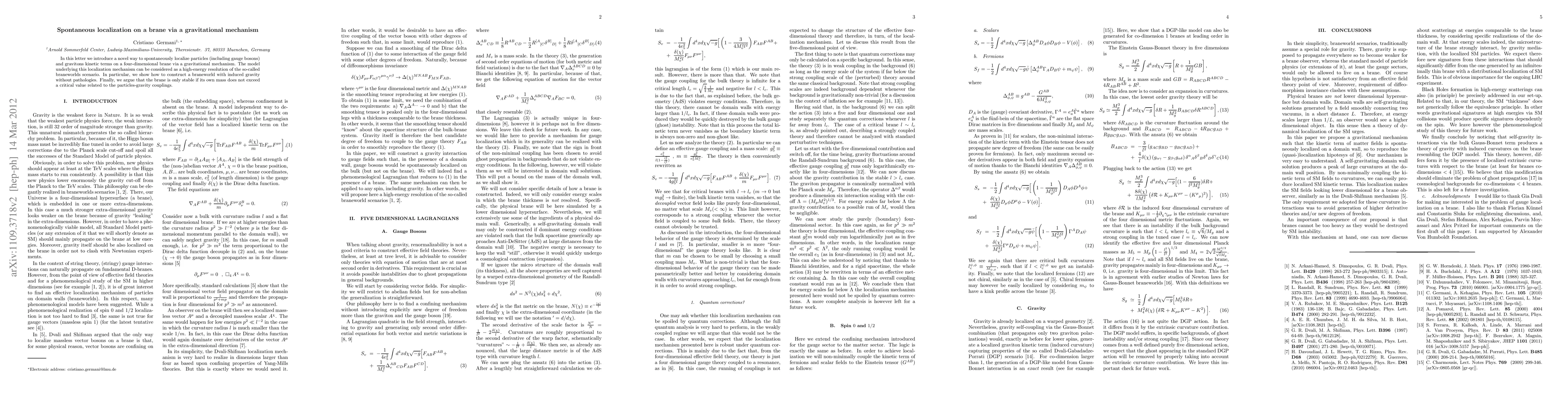 In this letter we introduce a novel way to spontaneously localize particles (including gauge bosons) and gravitons kinetic terms on a four-dimensional brane via a gravitational mechanism. The model underlying this localization mechanism can be considered as a high-energy resolution of the so-called braneworlds scenario. In particular, we show how to construct a braneworld with induced gravity without pathologies. Finally, we argue that the brane is only stable if its own mass does not exceed a critical value related to the particles-gravity couplings.