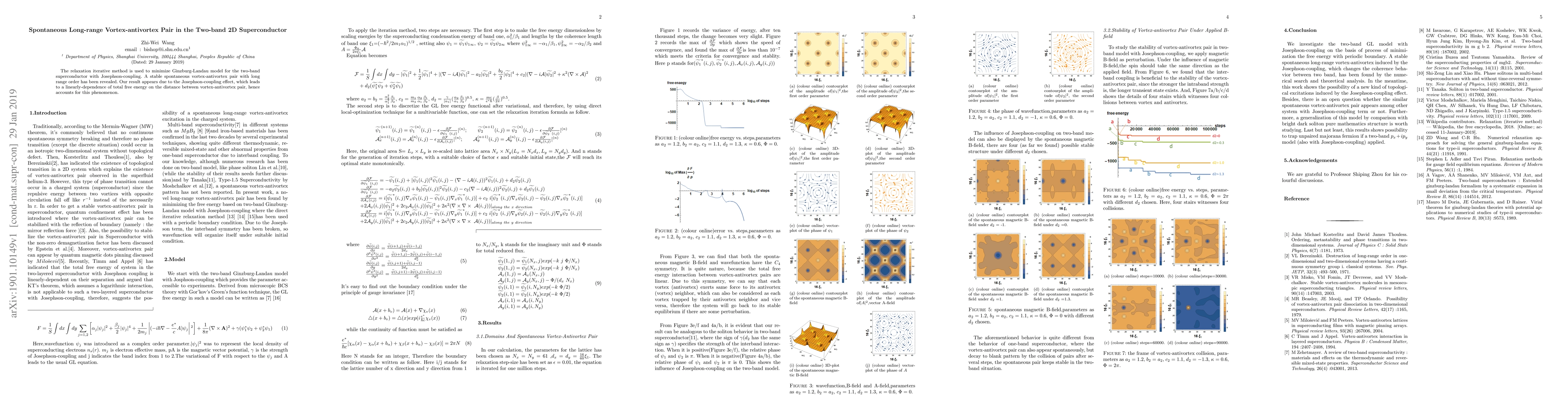 The relaxation iterative method is used to minimize Ginzburg-Landau model for the two-band superconductor with Josephson-coupling. A stable spontaneous vortex-antivortex pair with long range order has been revealed. Our result appears due to the Josephson-coupling effect, which leads to a linearly-dependence of total free energy on the distance between vortex-antivortex pair, hence accounts for this phenomenon.