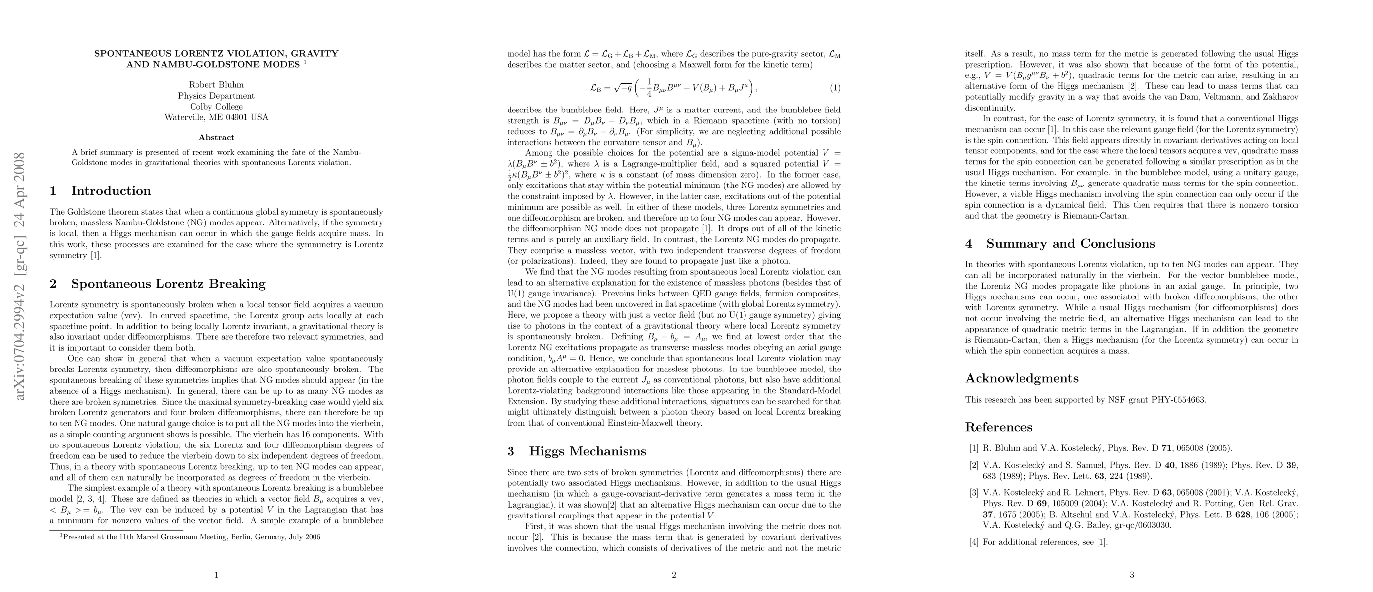 A brief summary is presented of recent work examining the fate of the Nambu-Goldstone modes in gravitational theories with spontaneous Lorentz violation.