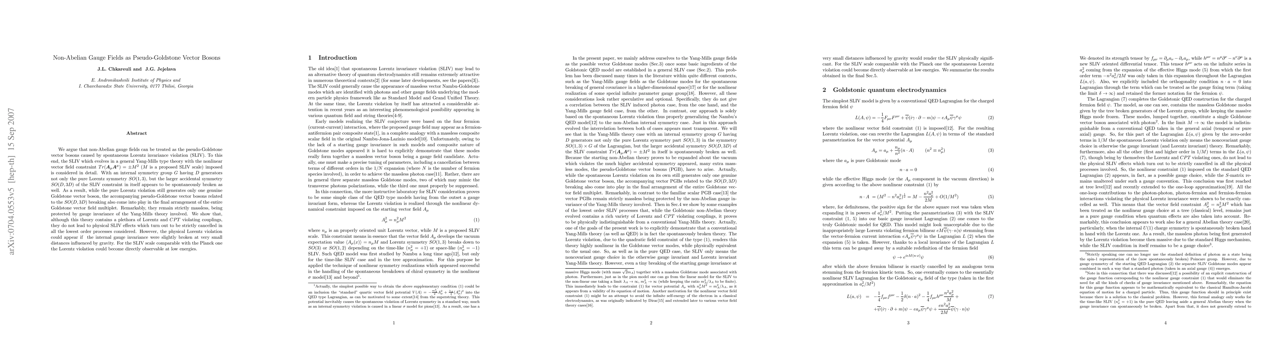 This paper proposes that non-Abelian gauge fields can be viewed as pseudo-Goldstone vector bosons resulting from spontaneous Lorentz violation in a Yang-Mills theory. The study finds that while the spontaneous Lorentz violation generates a single Goldstone boson, additional pseudo-Goldstone bosons emerge due to the breaking of the larger accidental symmetry $SO(D,3D)$, all remaining strictly massless. The paper concludes that physical Lorentz violation effects are canceled in lowest order processes, but could become observable at low energies if gauge invariance is slightly broken by gravity.