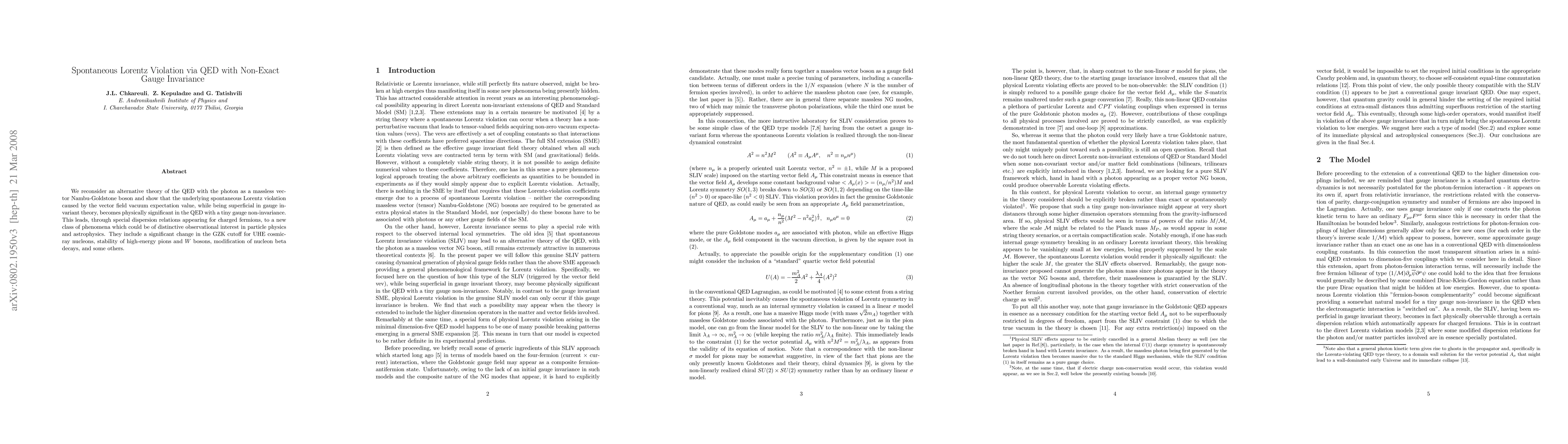 This paper explores an alternative QED model where the photon is a massless vector Nambu-Goldstone boson, revealing spontaneous Lorentz violation due to vector field vacuum expectation value. This violation, though superficial in exact gauge invariance, becomes significant in slightly non-exact gauge invariant theories, leading to observable phenomena such as changes in the GZK cutoff and modified nucleon beta decays.