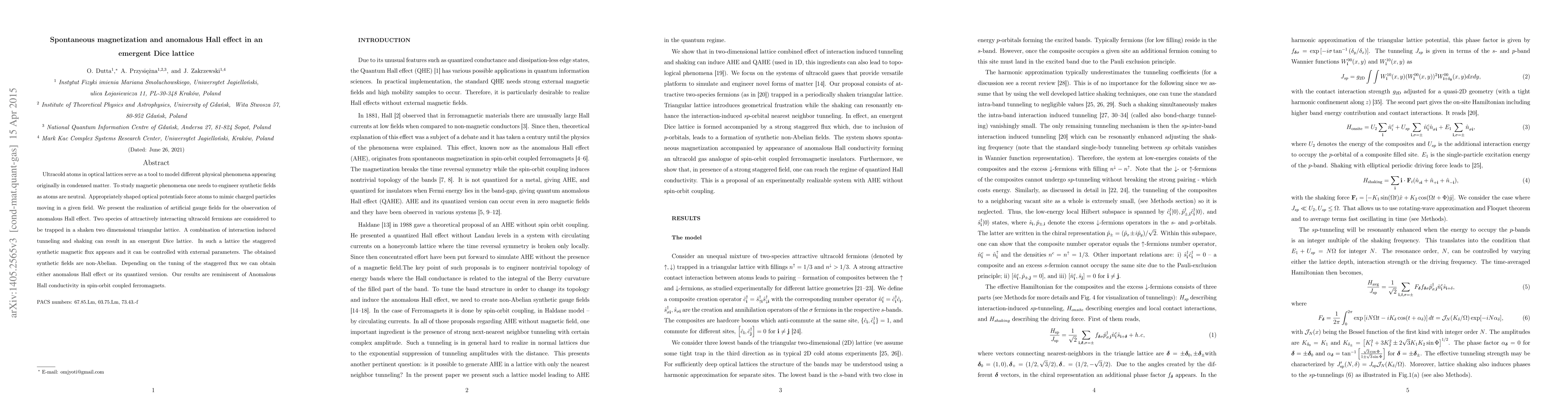 This paper investigates the spontaneous magnetization and anomalous Hall effect in an emergent Dice lattice formed by ultracold atoms in an optical lattice. By engineering synthetic gauge fields through shaped optical potentials, the study observes the anomalous Hall effect in a two-dimensional triangular lattice transformed into a Dice lattice, demonstrating non-Abelian synthetic fields and tunable staggered flux.