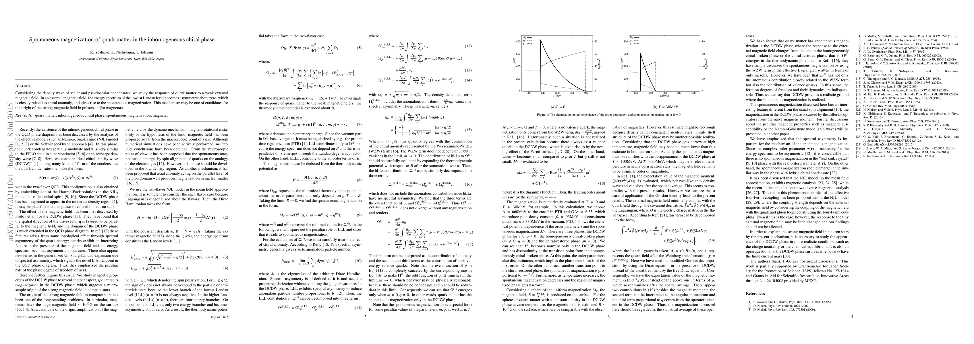 Considering the density wave of scalar and pseudoscalar condensates, we study the response of quark matter to a weak external magnetic field. In an external magnetic field, the energy spectrum of the lowest Landau level becomes asymmetric about zero, which is closely related to chiral anomaly, and gives rise to the spontaneous magnetization. This mechanism may be one of candidates for the origin of the strong magnetic field in pulsars and/or magnetars.