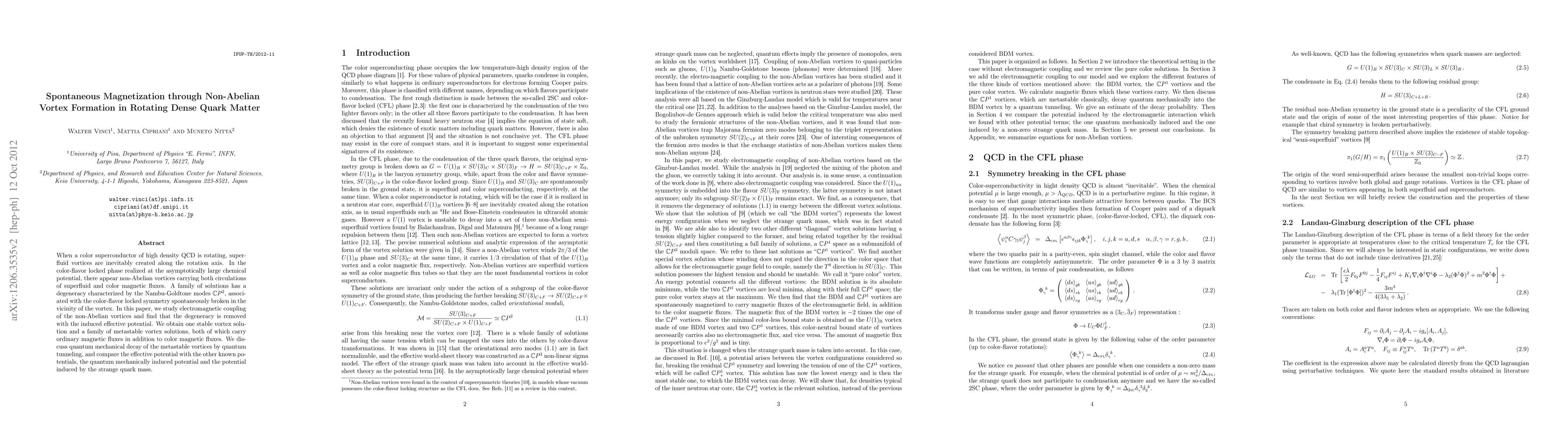 This paper investigates the electromagnetic coupling of non-Abelian vortices in rotating dense quark matter, revealing that the degeneracy of vortex solutions is lifted by an induced effective potential. It identifies stable and metastable vortex states, discussing the quantum mechanical decay of metastable states through tunneling.