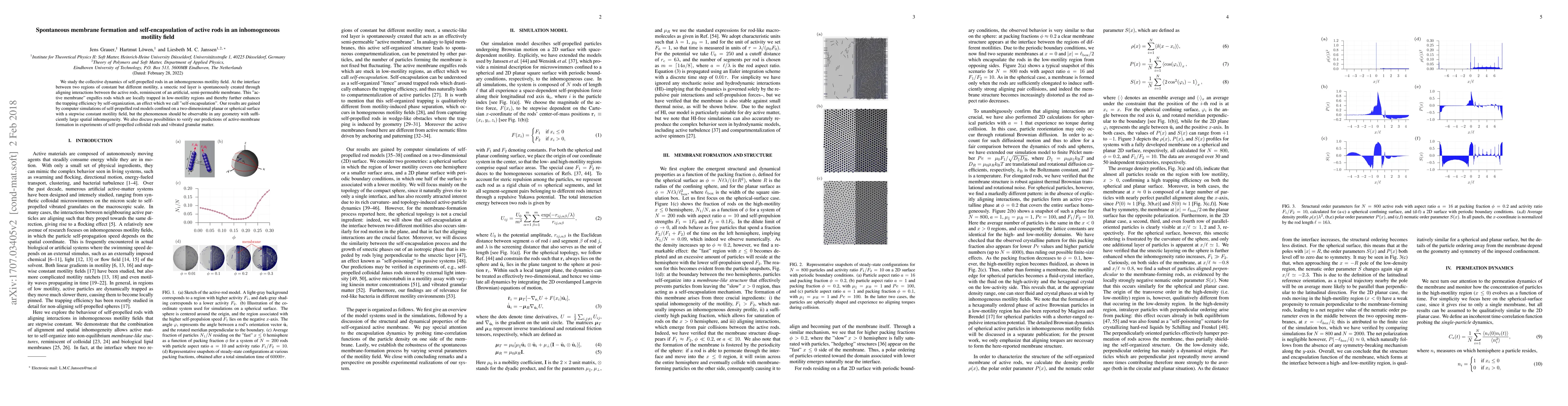 We study the collective dynamics of self-propelled rods in an inhomogeneous motility field. At the interface between two regions of constant but different motility, a smectic rod layer is spontaneously created through aligning interactions between the active rods, reminiscent of an artificial, semi-permeable membrane. This "active membrane" engulfes rods which are locally trapped in low-motility regions and thereby further enhances the trapping efficiency by self-organization, an effect which we call "self-encapsulation". Our results are gained by computer simulations of self-propelled rod models confined on a two-dimensional planar or spherical surface with a stepwise constant motility field, but the phenomenon should be observable in any geometry with sufficiently large spatial inhomogeneity. We also discuss possibilities to verify our predictions of active-membrane formation in experiments of self-propelled colloidal rods and vibrated granular matter.
