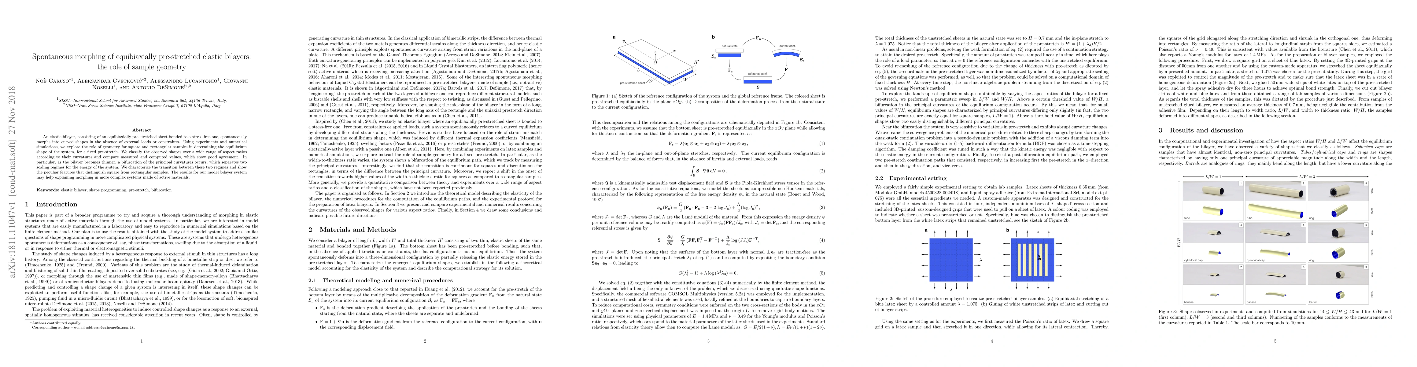 An elastic bilayer, consisting of an equibiaxially pre-stretched sheet bonded to a stress-free one, spontaneously morphs into curved shapes in the absence of external loads or constraints. Using experiments and numerical simulations, we explore the role of geometry for square and rectangular samples in determining the equilibrium shape of the system, for a fixed pre-stretch. We classify the observed shapes over a wide range of aspect ratios according to their curvatures and compare measured and computed values, which show good agreement. In particular, as the bilayer becomes thinner, a bifurcation of the principal curvatures occurs, which separates two scaling regimes for the energy of the system. We characterize the transition between these two regimes and show the peculiar features that distinguish square from rectangular samples. The results for our model bilayer system may help explaining morphing in more complex systems made of active materials.