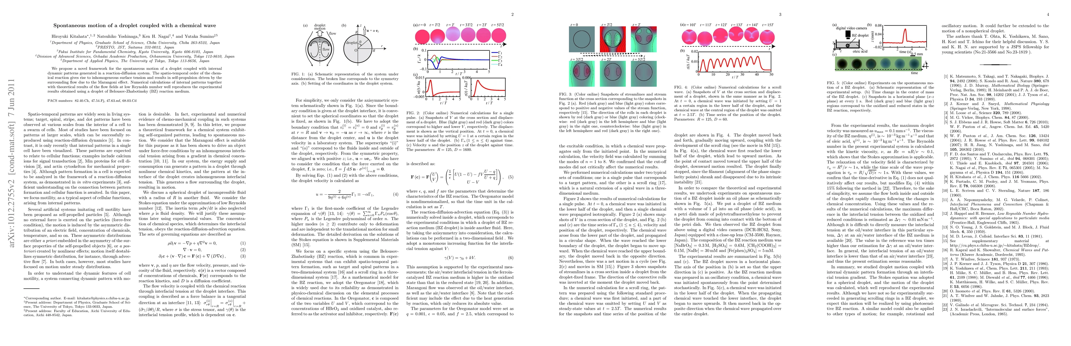 This paper presents a framework for the spontaneous motion of a droplet driven by internal chemical waves in a reaction-diffusion system, resulting in self-propulsion via the Marangoni effect. Numerical and theoretical analyses match experimental results from a droplet of Belousov-Zhabotinsky reaction medium.