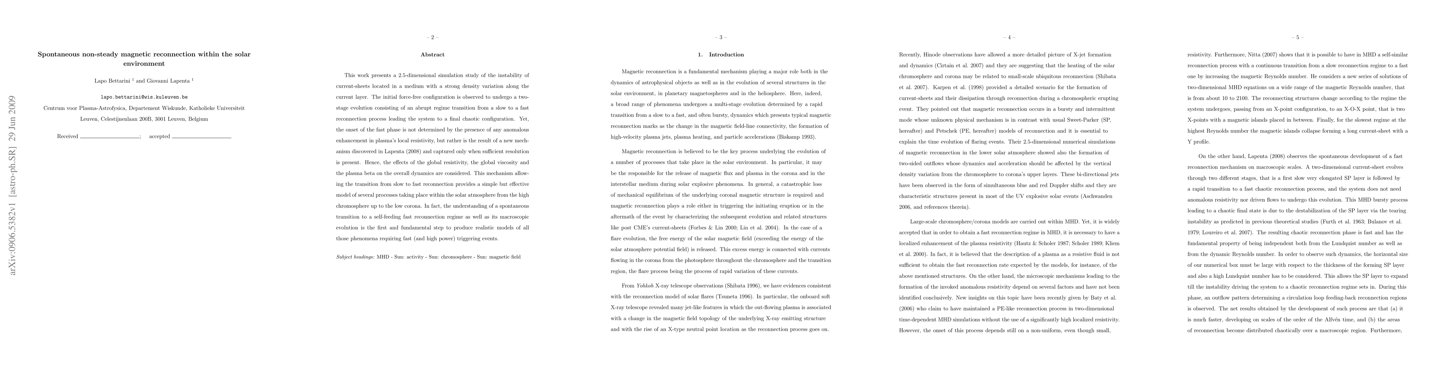 This work presents a 2.5-dimensional simulation study of the instability of current-sheets located in a medium with a strong density variation along the current layer. The initial force-free configuration is observed to undergo a two-stage evolution consisting of an abrupt regime transition from a slow to a fast reconnection process leading the system to a final chaotic configuration. Yet, the onset of the fast phase is not determined by the presence of any anomalous enhancement in plasma's local resistivity, but rather is the result of a new mechanism discovered in Lapenta (2008)* and captured only when sufficient resolution is present. Hence, the effects of the global resistivity, the global viscosity and the plasma beta on the overall dynamics are considered. This mechanism allowing the transition from slow to fast reconnection provides a simple but effective model of several processes taking place within the solar atmosphere from the high chromosphere up to the low corona. In fact, the understanding of a spontaneous transition to a self-feeding fast reconnection regime as well as its macroscopic evolution is the first and fundamental step to produce realistic models of all those phenomena requiring fast (and high power) triggering events (* Lapenta G. 2008, Phys. Rev. Lett., 100, 235001).