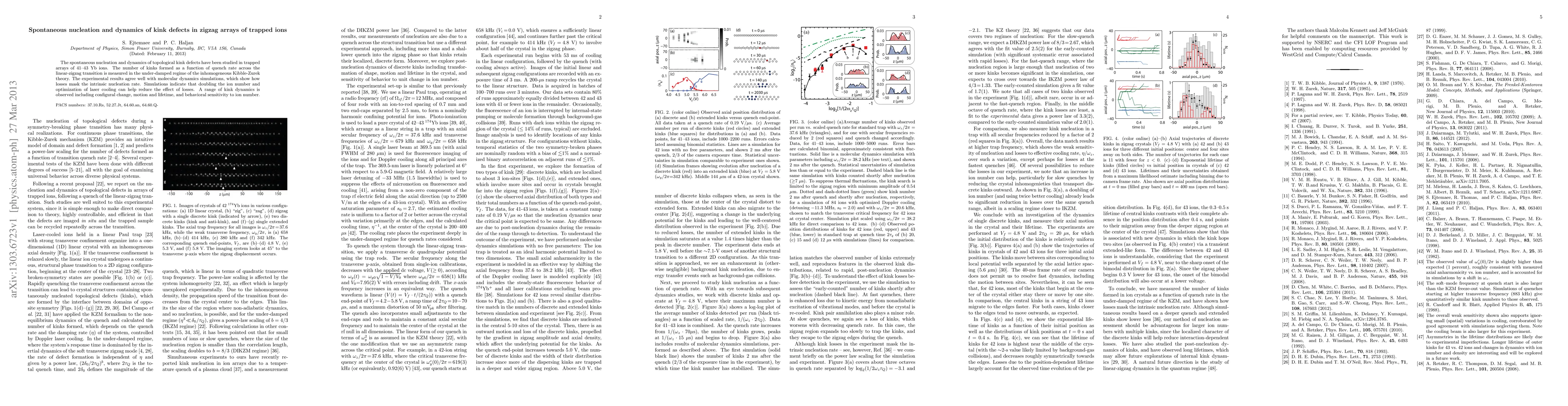 This study investigates the spontaneous nucleation and dynamics of kink defects in zigzag arrays of 41-43 Yb ions, finding agreement between experimental results and molecular dynamics simulations. The research highlights how losses affect intrinsic nucleation rates and suggests that increasing ion number and optimizing laser cooling could mitigate these effects.