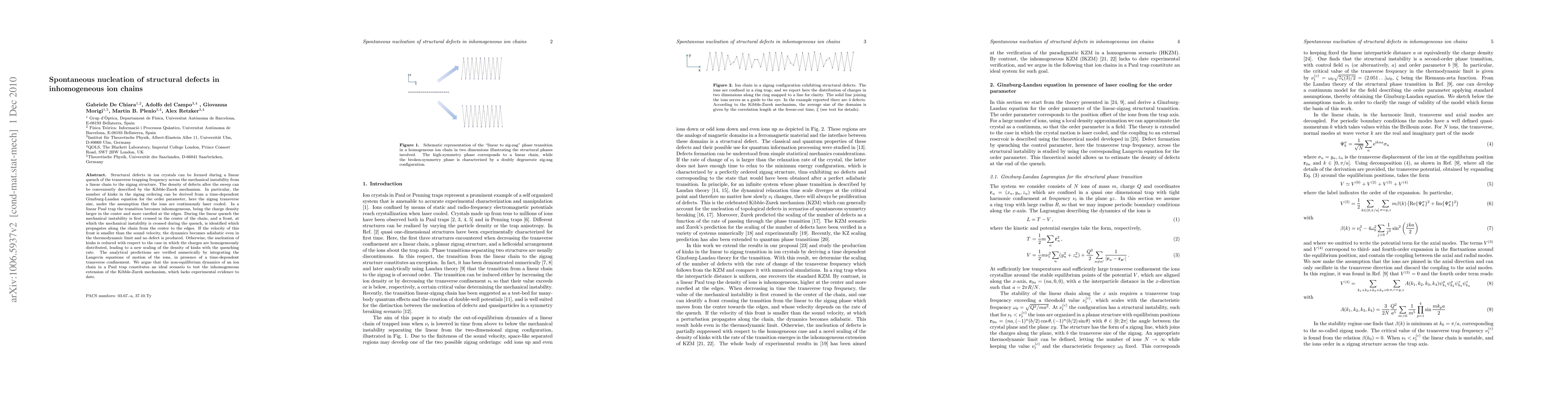 This paper investigates the spontaneous formation of structural defects in inhomogeneous ion chains during a linear quench, demonstrating that the density of defects follows a modified Kibble-Zurek scaling due to the inhomogeneous charge distribution in a Paul trap. Numerical simulations confirm the analytical predictions, suggesting this system as a testbed for the inhomogeneous Kibble-Zurek mechanism.