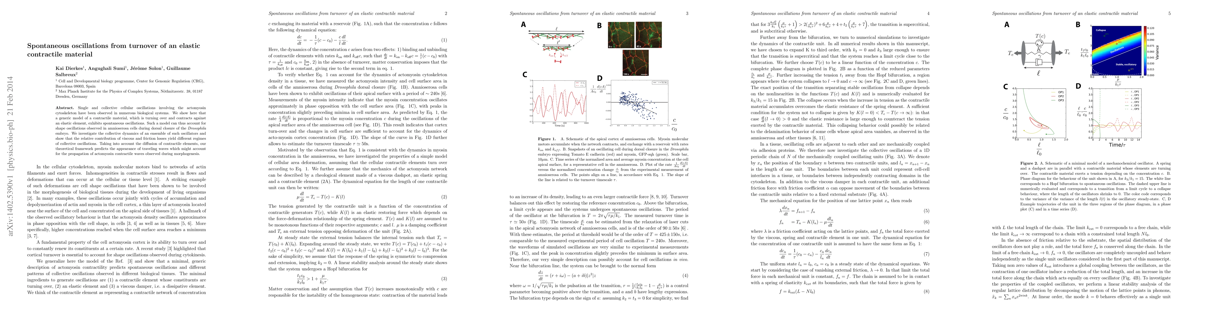 This paper demonstrates that a contractile material model with turnover and elastic resistance can exhibit spontaneous oscillations, analogous to those seen in amnioserosa cells during Drosophila embryogenesis. The study explores how varying viscous and friction losses influence collective oscillation dynamics, predicting the emergence of traveling waves that may explain morphogenic contractile wave propagation.