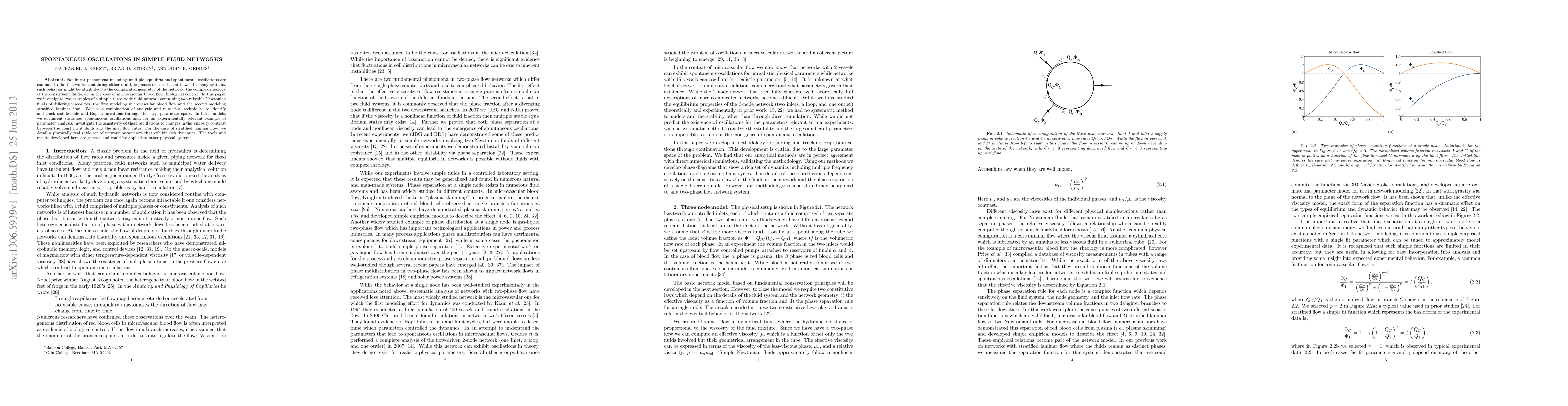 Nonlinear phenomena including multiple equilibria and spontaneous oscillations are common in fluid networks containing either multiple phases or constituent flows. In many systems, such behavior might be attributed to the complicated geometry of the network, the complex rheology of the constituent fluids, or, in the case of microvascular blood flow, biological control. In this paper we investigate two examples of a simple three-node fluid network containing two miscible Newtonian fluids of differing viscosities, the first modeling microvascular blood flow and the second modeling stratified laminar flow. We use a combination of analytic and numerical techniques to identify and track saddle-node and Hopf bifurcations through the large parameter space. In both models, we document sustained spontaneous oscillations and, for an experimentally relevant example of parameter analysis, investigate the sensitivity of these oscillations to changes in the viscosity contrast between the constituent fluids and the inlet flow rates. For the case of stratified laminar flow, we detail a physically realizable set of network parameters that exhibit rich dynamics. The tools and results developed here are general and could be applied to other physical systems.