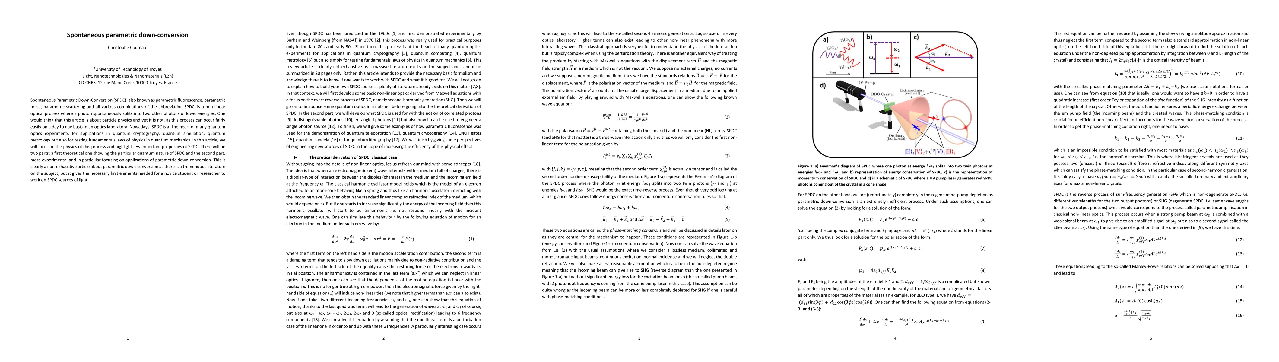 Spontaneous Parametric Down-Conversion (SPDC), also known as parametric fluorescence, parametric noise, parametric scattering and all various combinations of the abbreviation SPDC, is a non-linear optical process where a photon spontaneously splits into two other photons of lower energies. One would think that this article is about particle physics and yet it is not, as this process can occur fairly easily on a day to day basis in an optics laboratory. Nowadays, SPDC is at the heart of many quantum optics experiments for applications in quantum cryptography, quantum simulation, quantum metrology but also for testing fundamentals laws of physics in quantum mechanics. In this article, we will focus on the physics of this process and highlight few important properties of SPDC. There will be two parts: a first theoretical one showing the particular quantum nature of SPDC and the second part, more experimental and in particular focusing on applications of parametric down-conversion. This is clearly a non-exhaustive article about parametric down-conversion as there is a tremendous literature on the subject, but it gives the necessary first elements needed for a novice student or researcher to work on SPDC sources of light.