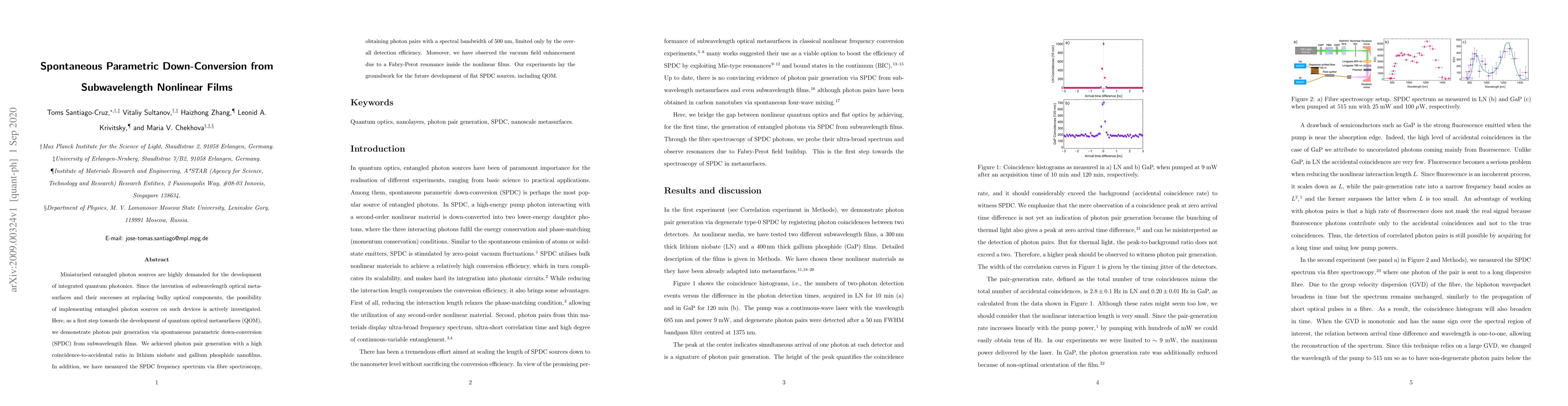 Miniaturised entangled photon sources are highly demanded for the development of integrated quantum photonics. Since the invention of subwavelength optical metasurfaces and their successes at replacing bulky optical components, the possibility of implementing entangled photon sources on such devices is actively investigated. Here, as a first step towards the development of quantum optical metasurfaces (QOM), we demonstrate photon pair generation via spontaneous parametric down-conversion (SPDC) from subwavelength films. We achieved photon pair generation with a high coincidence-to-accidental ratio in lithium niobate and gallium phosphide nanofilms. In addition, we have measured the SPDC frequency spectrum via fibre spectroscopy, obtaining photon pairs with a spectral bandwidth of 500\;nm, limited only by the overall detection efficiency. Moreover, we have observed the vacuum field enhancement due to a Fabry-Perot resonance inside the nonlinear films. Our experiments lay the groundwork for the future development of flat SPDC sources, including QOM.