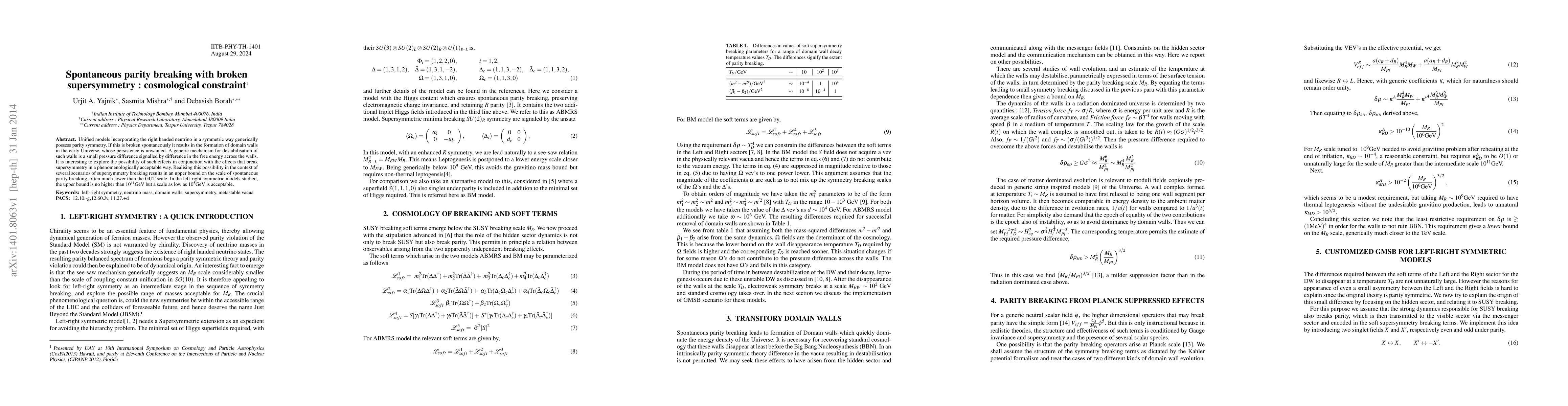 Unified models incorporating the right handed neutrino in a symmetric way generically possess parity symmetry. If this is broken spontaneously it results in the formation of domain walls in the early Universe, whose persistence is unwanted. A generic mechanism for destabilisation of such walls is a small pressure difference signalled by difference in the free energy across the walls. It is interesting to explore the possibility of such effects in conjunction with the effects that break supersymmetry in a phenomenologically acceptable way. Realising this possibility in the context of several scenarios of supersymmetry breaking results in an upper bound on the scale of spontaneous parity breaking, often much lower than the GUT scale. In the left-right symmetric models studied, the upper bound is no higher than $10^{11}$GeV but a scale as low as $10^5$GeV is acceptable.