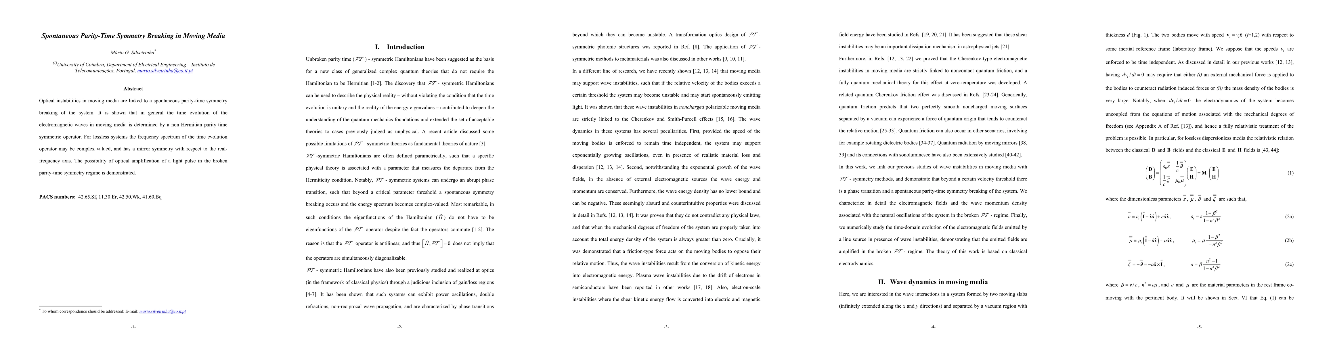 This paper explores optical instabilities in moving media, revealing spontaneous parity-time symmetry breaking governed by a non-Hermitian operator. It demonstrates that lossless systems can exhibit complex frequency spectra with mirror symmetry, enabling optical amplification in the broken parity-time symmetry regime.