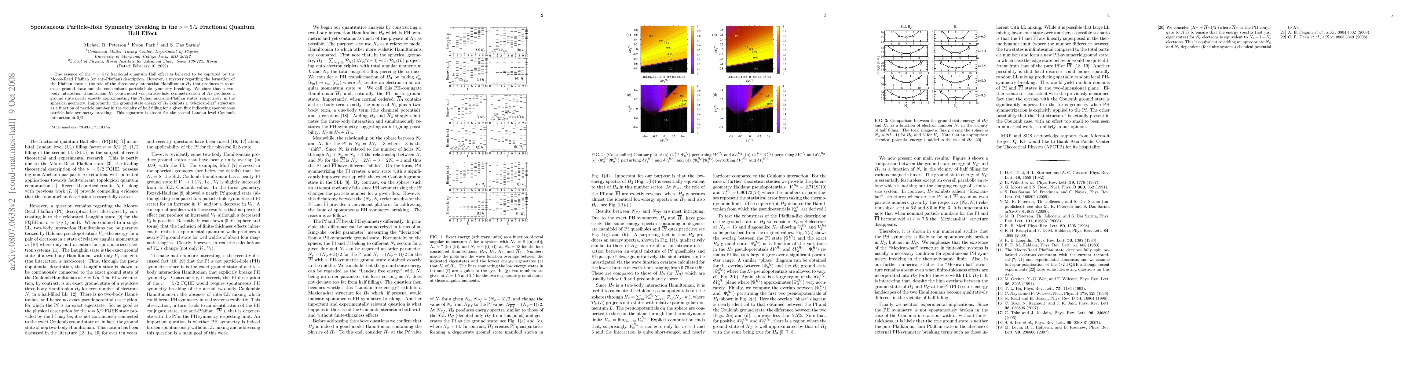 This research reveals that a two-body interaction Hamiltonian, derived from particle-hole symmetrization of a three-body interaction, can generate a ground state closely resembling the Pfaffian state in the $\nu=5/2$ fractional quantum Hall effect, exhibiting spontaneous particle-hole symmetry breaking in a "Mexican-hat" energy structure.