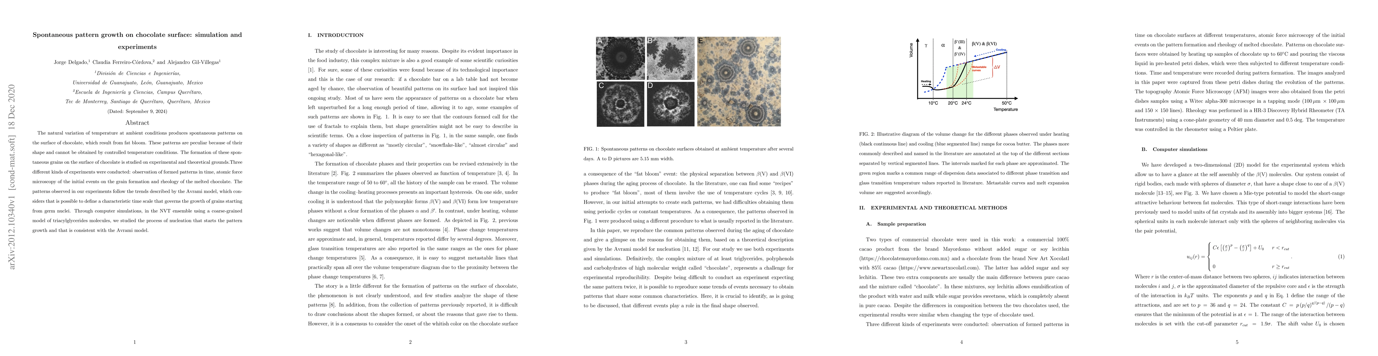 The natural variation of temperature at ambient conditions produces spontaneous patterns on the surface of chocolate, which result from fat bloom. These patterns are peculiar because of their shape and cannot be obtained by controlled temperature conditions. The formation of these spontaneous grains on the surface of chocolate is studied on experimental and theoretical grounds.Three different kinds of experiments were conducted: observation of formed patterns in time, atomic force microscopy of the initial events on the grain formation and rheology of the melted chocolate. The patterns observed in our experiments follow the trends described by the Avrami model, which considers that is possible to define a characteristic time scale that governs the growth of grains starting from germ nuclei. Through computer simulations, in the NVT ensemble using a coarse-grained model of triacylglycerides molecules, we studied the process of nucleation that starts the pattern growth and that is consistent with the Avrami model.