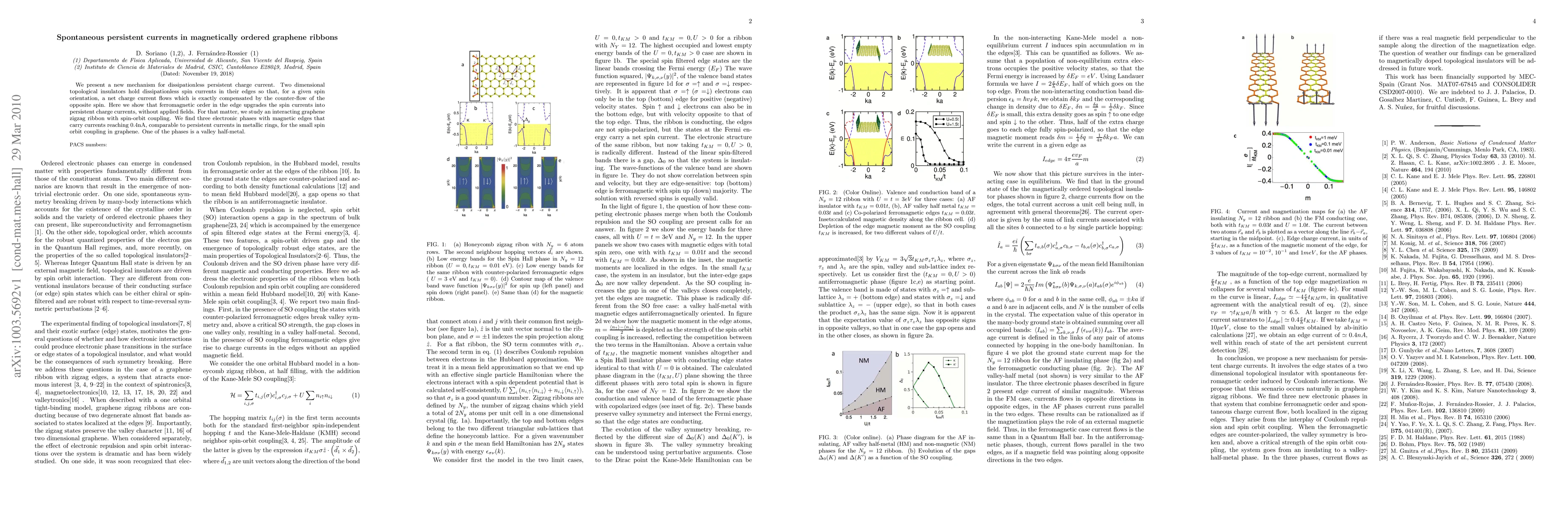 We present a new mechanism for dissipationless persistent charge current. Two dimensional topological insulators hold dissipationless spin currents in their edges so that, for a given spin orientation, a net charge current flows which is exactly compensated by the counter-flow of the opposite spin. Here we show that ferromagnetic order in the edge upgrades the spin currents into persistent charge currents, without applied fields. For that matter, we study an interacting graphene zigzag ribbon with spin-orbit coupling. We find three electronic phases with magnetic edges that carry currents reaching 0.4nA, comparable to persistent currents in metallic rings, for the small spin orbit coupling in graphene. One of the phases is a valley half-metal.