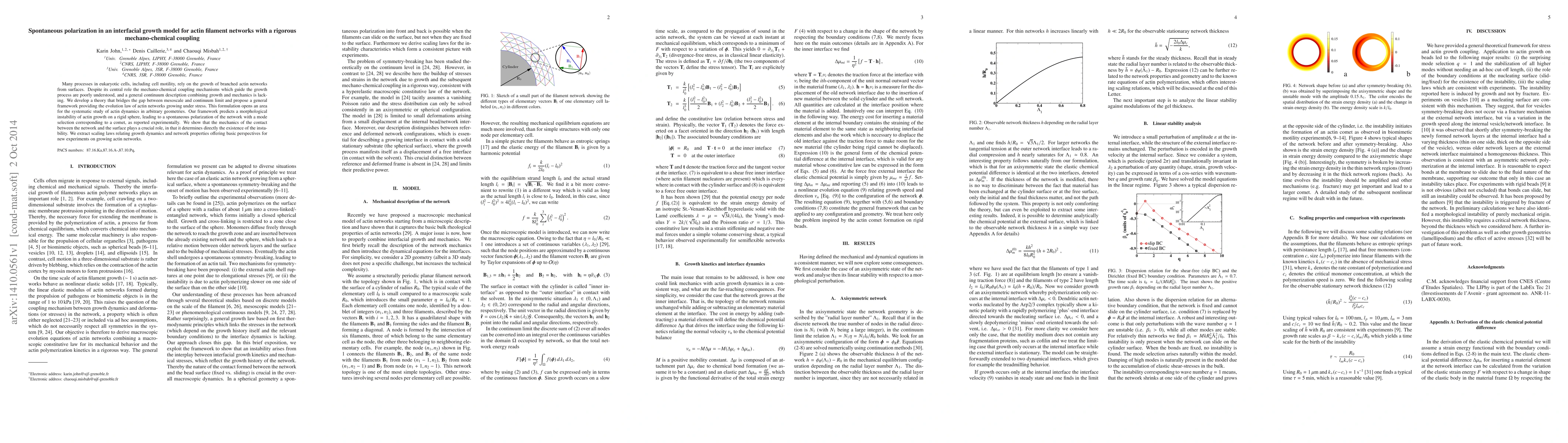 This paper develops a theoretical framework to describe the mechano-chemical coupling in actin filament networks growing on surfaces, predicting spontaneous polarization and morphological instability, and offering scaling laws for future experimental studies. The mechanics of network-surface contact is shown to determine the network's instability and growth dynamics.