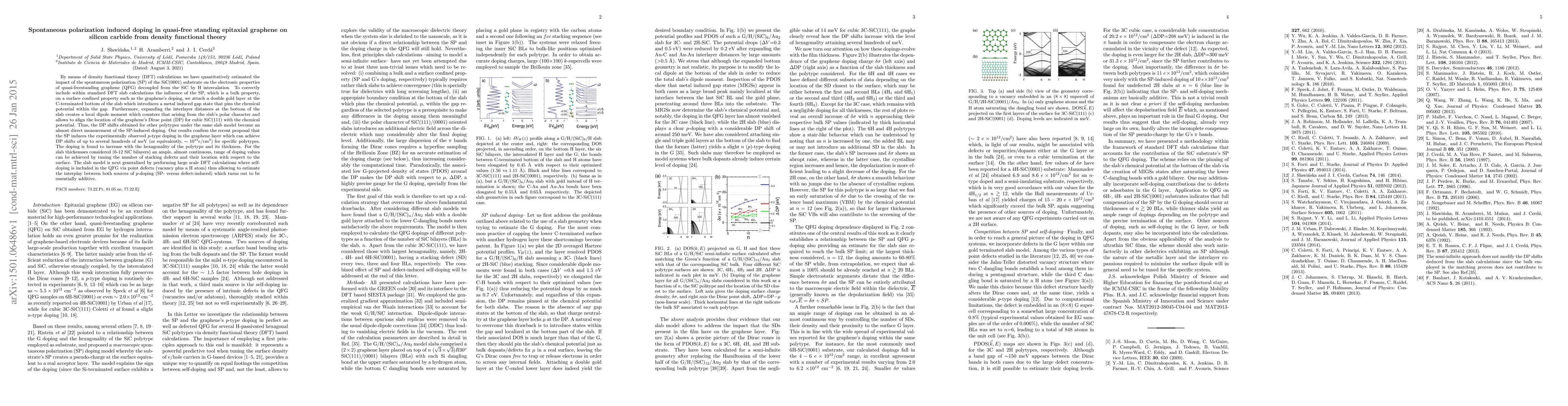 By means of density functional theory (DFT) calculations we have quantitatively estimated the impact of the spontaneous polarization (SP) of the SiC(0001) substrate on the electronic properties of quasi-freestanding graphene (QFG) decoupled from the SiC by H intercalation. To correctly include within standard DFT slab calculations the influence of the SP, which is a bulk property, on a surface confined property such as the graphene's doping, we attach a double gold layer at the C-terminated bottom of the slab which introduces a metal induced gap state that pins the chemical potential within the gap. Furthermore, expanding the interlayer distances at the bottom of the slab creates a local dipole moment which counters that arising from the slab's polar character and allows to align the location of the graphene's Dirac point (DP) for cubic SiC(111) with the chemical potential. Thus, the DP shifts obtained for other polytypes under the same slab model become an almost direct measurement of the SP-induced doping. Our results confirm the recent proposal that the SP induces the experimentally observed p-type doping in the graphene layer which can achieve DP shifts of up to several hundreds of meV (or equivalently, $\sim 10^{13} e$/cm$^2$) for specific polytypes. The doping is found to increase with the hexagonality of the polytype and its thickness. For the slab thickensses considered (6-12 SiC bilayers) an ample, almost continuous, range of doping values can be achieved by tuning the number of stacking defects and their location with respect to the surface. The slab model is next generalized by performing large scale DFT calculations where self-doping is included in the QFG via point defects (vacancy plus a H atom) thus allowing to estimate the interplay between both sources of p-doping (SP- versus defect-induced) which turns out to be essentially additive.