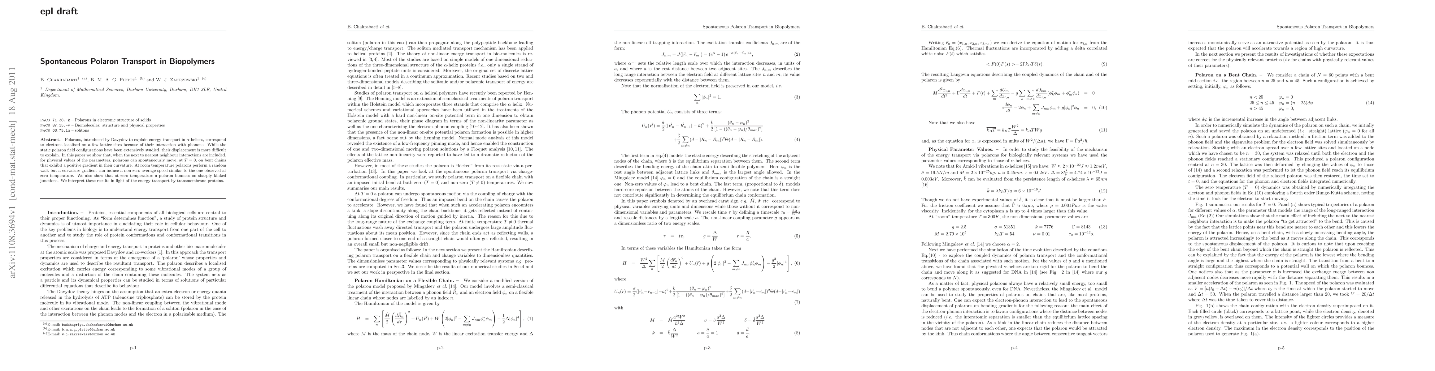 Polarons, introduced by Davydov to explain energy transport in $\alpha$-helices, correspond to electrons localised on a few lattice sites because of their interaction with phonons. While the static polaron field configurations have been extensively studied, their displacement is more difficult to explain. In this paper we show that, when the next to nearest neighbour interactions are included, for physical values of the parameters, polarons can spontaneously move, at T=0, on bent chains that exhibit a positive gradient in their curvature. At room temperature polarons perform a random walk but a curvature gradient can induce a non-zero average speed similar to the one observed at zero temperature. We also show that at zero temperature a polaron bounces on sharply kinked junctions. We interpret these results in light of the energy transport by transmembrane proteins.