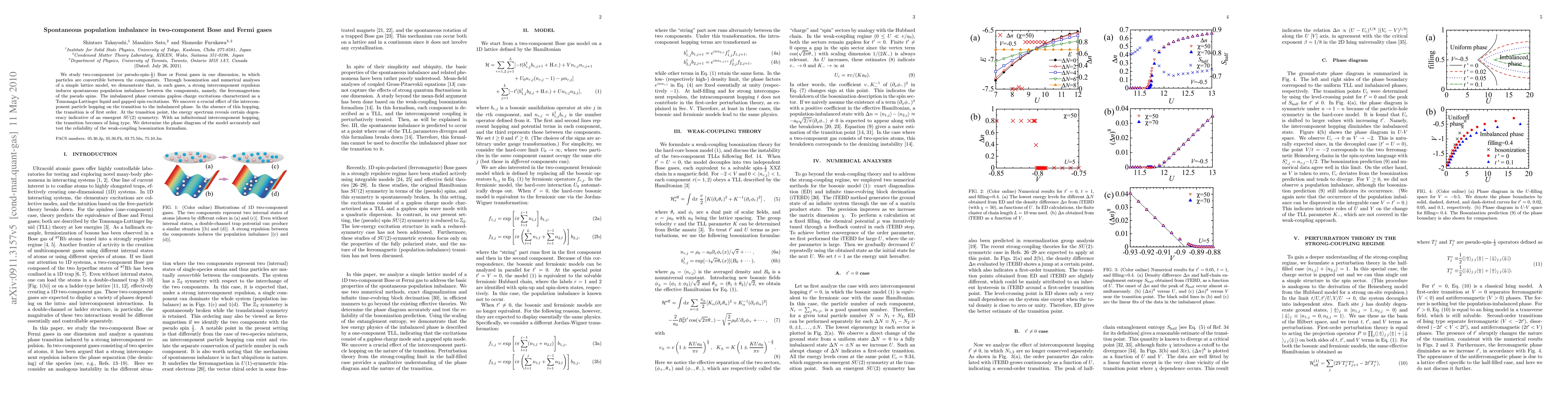 This paper investigates one-dimensional two-component Bose and Fermi gases, showing that strong intercomponent repulsion leads to spontaneous population imbalance, or pseudo-spin ferromagnetism. The study reveals that intercomponent hopping influences the transition type and phase diagram, with first-order transitions in its absence and Ising-type transitions with minimal hopping.