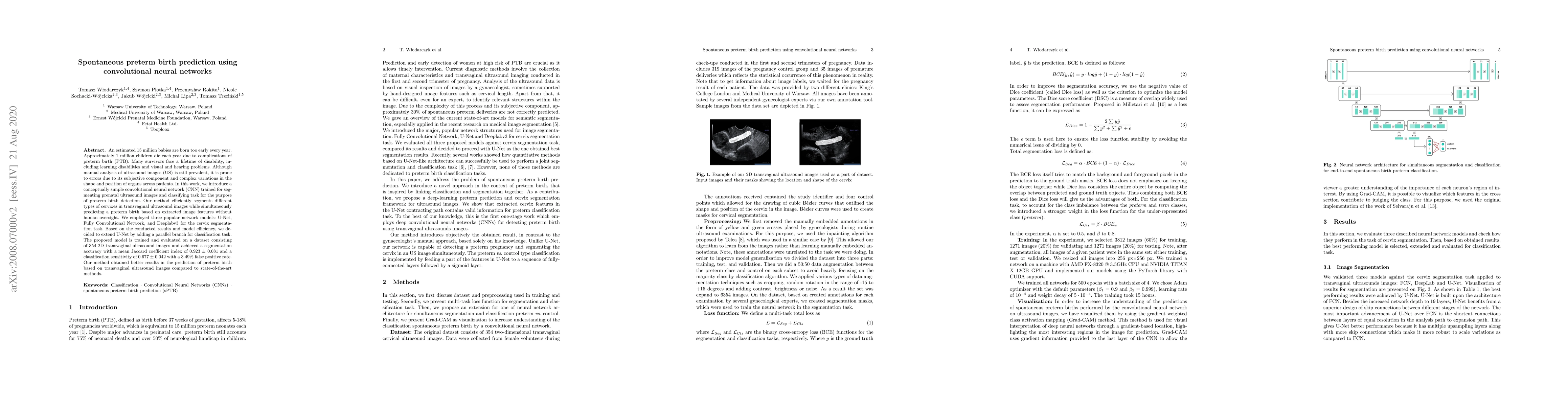 This paper proposes a convolutional neural network (CNN) to predict spontaneous preterm birth using transvaginal ultrasound images. The U-Net model, enhanced with a parallel branch for classification, achieved a segmentation accuracy of 0.923 and a classification sensitivity of 0.677, outperforming existing methods.