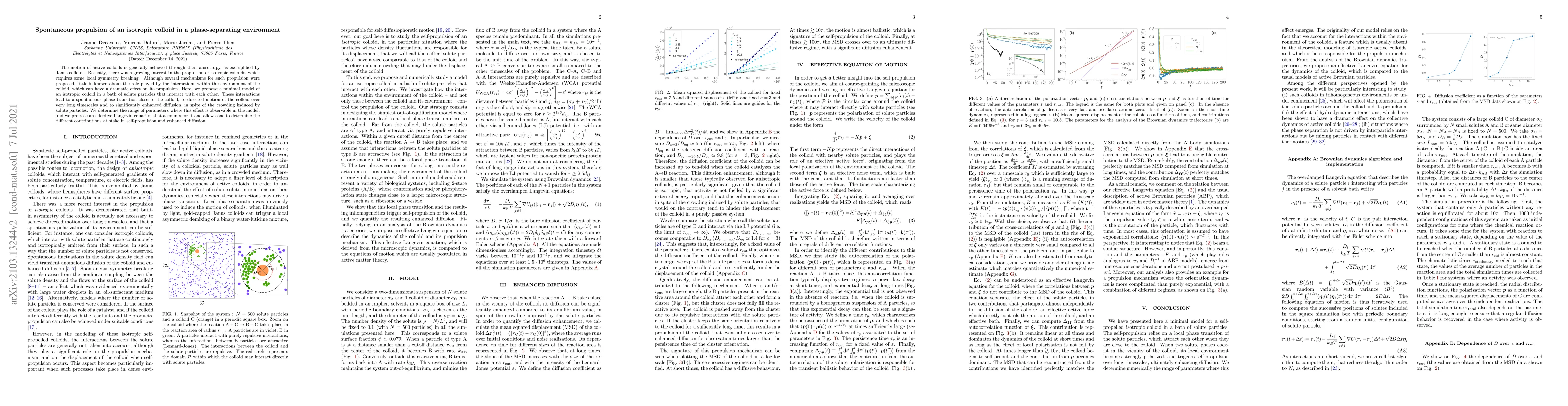 This paper investigates the spontaneous propulsion of an isotropic colloid in an environment where solute particles undergo phase separation, leading to directed motion and enhanced diffusion despite crowding. An effective Langevin equation is proposed to model these effects and determine their contributions.