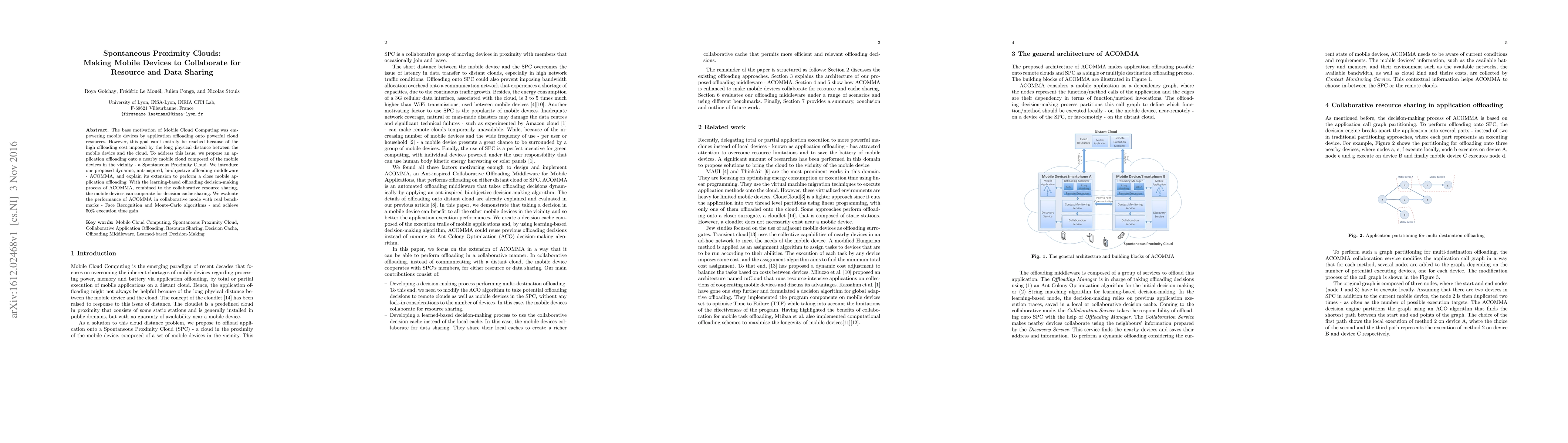 This paper proposes a Spontaneous Proximity Cloud to reduce offloading costs by offloading applications to nearby mobile devices instead of distant clouds. The introduced ACOMMA middleware enables efficient, collaborative resource and data sharing among mobile devices, achieving a 50% execution time gain in benchmarks.