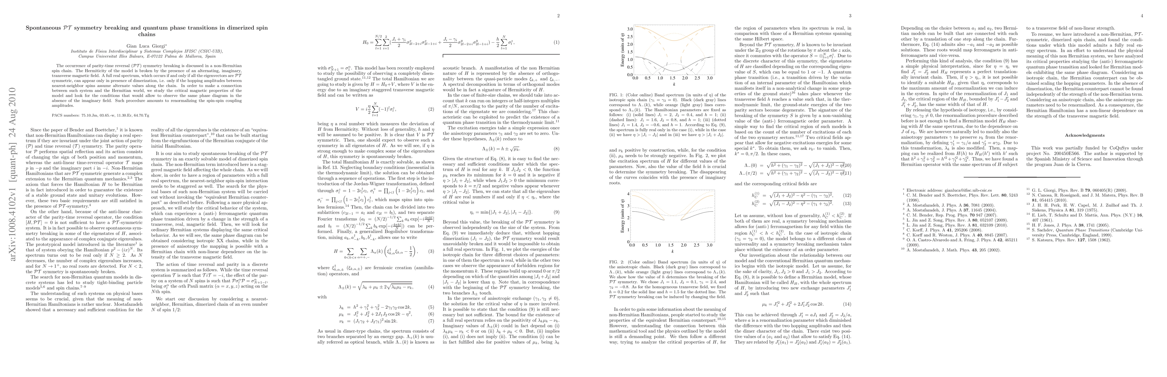 The occurrence of parity-time reversal ($\mathcal{PT}$) symmetry breaking is discussed in a non-Hermitian spin chain. The Hermiticity of the model is broken by the presence of an alternating, imaginary, transverse magnetic field. A full real spectrum, which occurs if and only if all the eigenvectors are $\mathcal{PT}$ symmetric, can appear only in presence of dimerization, i.e. only if the hopping amplitudes between nearest-neighbor spins assume alternate values along the chain. In order to make a connection between such system and the Hermitian world, we study the critical magnetic properties of the model and look for the conditions that would allow to observe the same phase diagram in the absence of the imaginary field. Such procedure amounts to renormalizing the spin-spin coupling amplitudes.