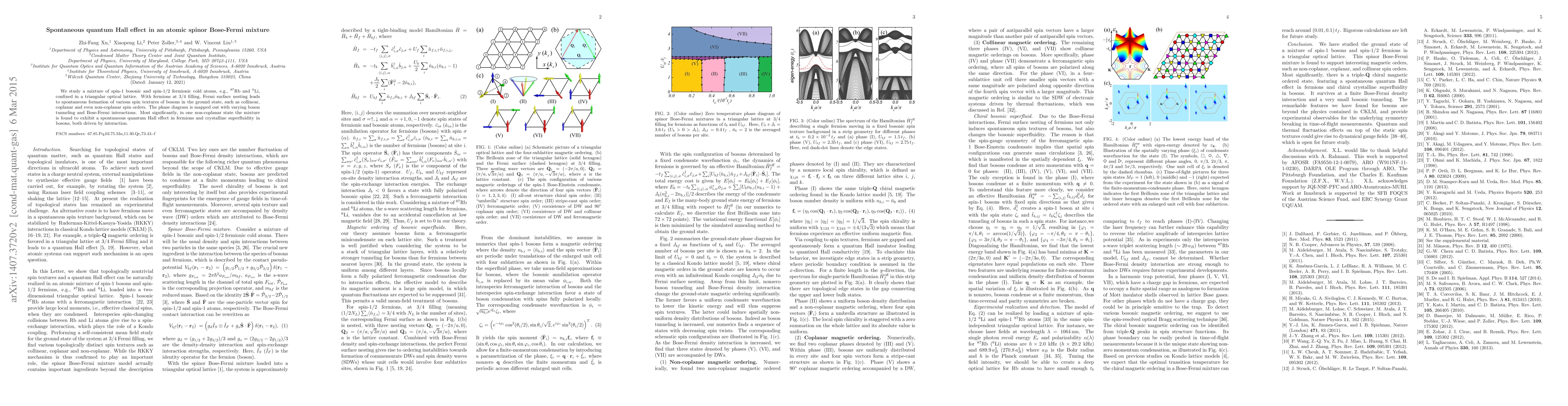We study a mixture of spin-$1$ bosonic and spin-$1/2$ fermionic cold atoms, e.g., $^{87}$Rb and $^{6}$Li, confined in a triangular optical lattice. With fermions at $3/4$ filling, Fermi surface nesting leads to spontaneous formation of various spin textures of bosons in the ground state, such as collinear, coplanar and even non-coplanar spin orders. The phase diagram is mapped out with varying boson tunneling and Bose-Fermi interactions. Most significantly, in one non-coplanar state the mixture is found to exhibit a spontaneous quantum Hall effect in fermions and crystalline superfluidity in bosons, both driven by interaction.
