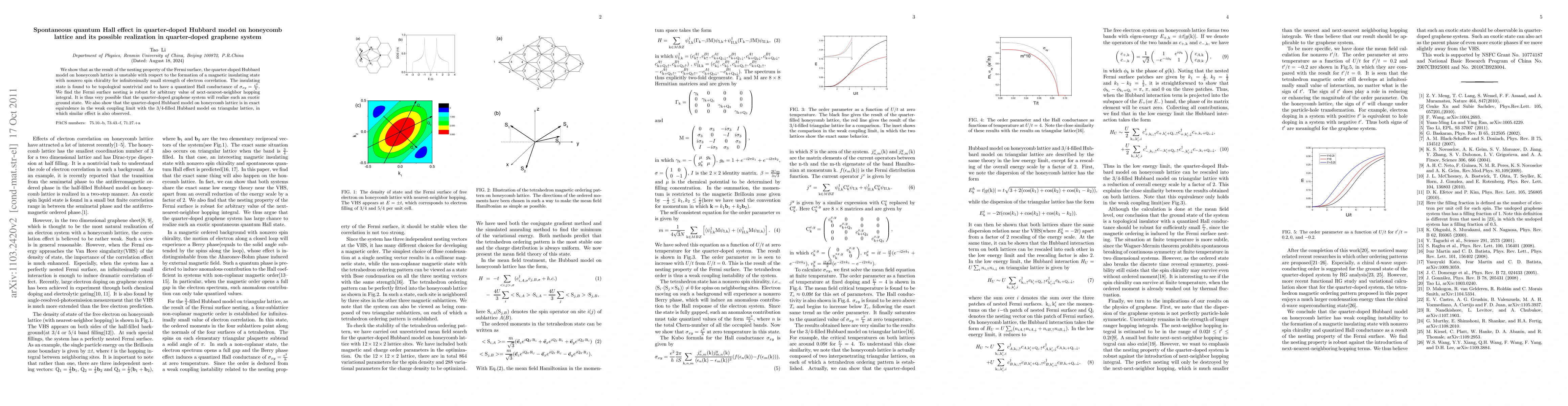 This research demonstrates that the quarter-doped Hubbard model on a honeycomb lattice exhibits a spontaneous quantum Hall effect due to Fermi surface nesting, leading to a topologically nontrivial magnetic insulating state with quantized Hall conductance. The findings suggest that quarter-doped graphene could realize this exotic ground state, mirroring effects seen in the 3/4-filled Hubbard model on a triangular lattice.