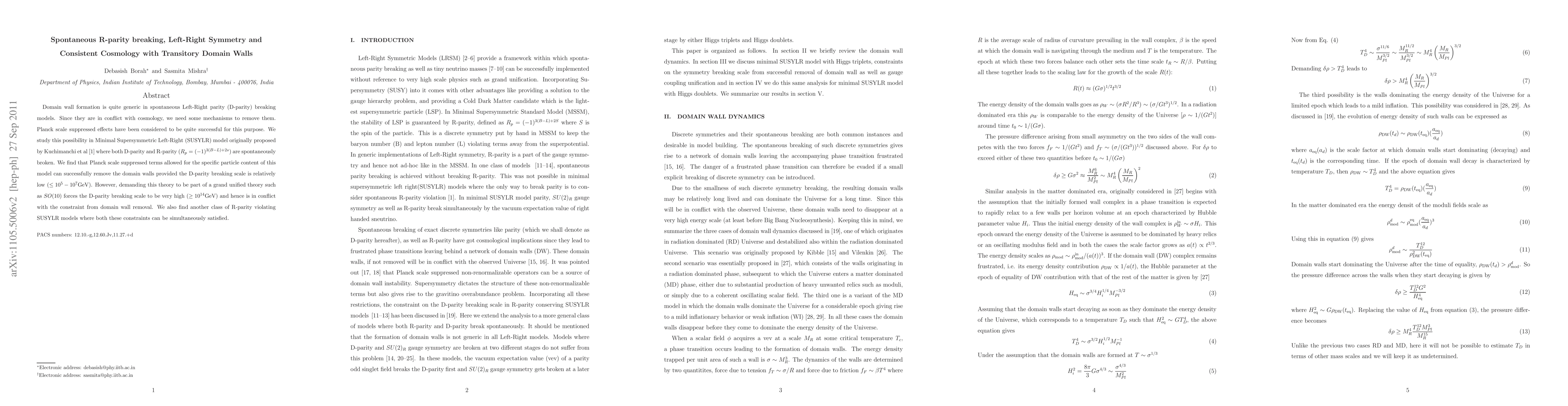 This paper explores the spontaneous breaking of Left-Right symmetry and R-parity in the Minimal Supersymmetric Left-Right model, finding that low D-parity breaking scales can resolve cosmological issues caused by domain walls. However, embedding this model in a grand unified theory like SO(10) raises high D-parity breaking scales, conflicting with cosmological constraints, unless alternative R-parity violating models are considered.