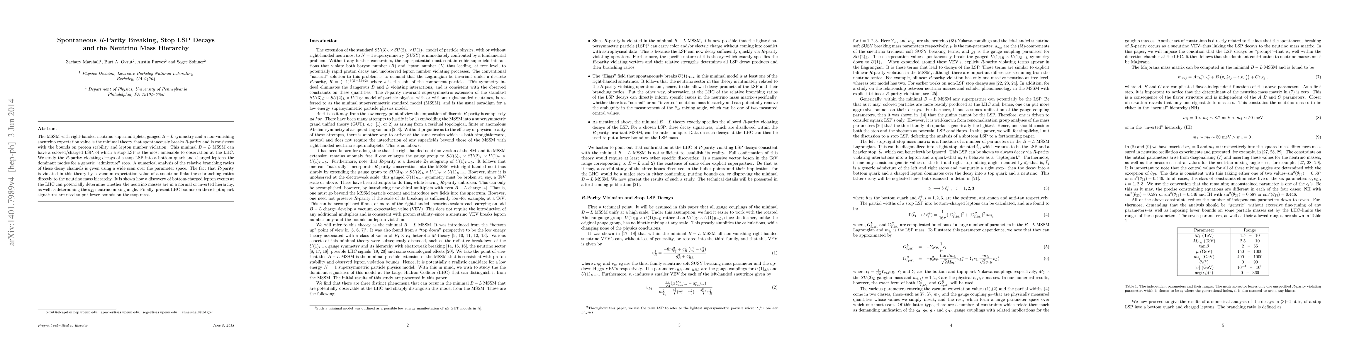 The MSSM with right-handed neutrino supermultiplets, gauged B-L symmetry and a non-vanishing sneutrino expectation value is the minimal theory that spontaneously breaks R-parity and is consistent with the bounds on proton stability and lepton number violation. This minimal B-L MSSM can have a colored/charged LSP, of which a stop LSP is the most amenable to observation at the LHC. We study the R-parity violating decays of a stop LSP into a bottom quark and charged leptons--the dominant modes for a generic "admixture" stop. A numerical analysis of the relative branching ratios of these decay channels is given using a wide scan over the parameter space. The fact that R-parity is violated in this theory by a vacuum expectation value of a sneutrino links these branching ratios directly to the neutrino mass hierarchy. It is shown how a discovery of bottom-charged lepton events at the LHC can potentially determine whether the neutrino masses are in a normal or inverted hierarchy, as well as determining the theta_23 neutrino mixing angle. Finally, present LHC bounds on these leptoquark signatures are used to put lower bounds on the stop mass.