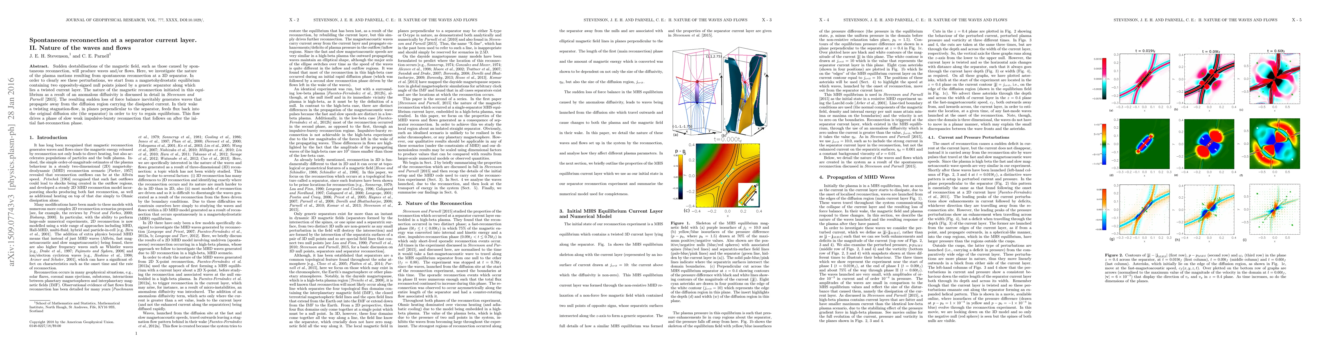 This paper investigates plasma motions and waves generated by spontaneous reconnection at a 3D separator current layer, revealing waves propagating away from the diffusion region and a twisting stagnation-flow that feeds back flux to regain equilibrium, followed by a phase of slow impulsive-bursty reconnection.