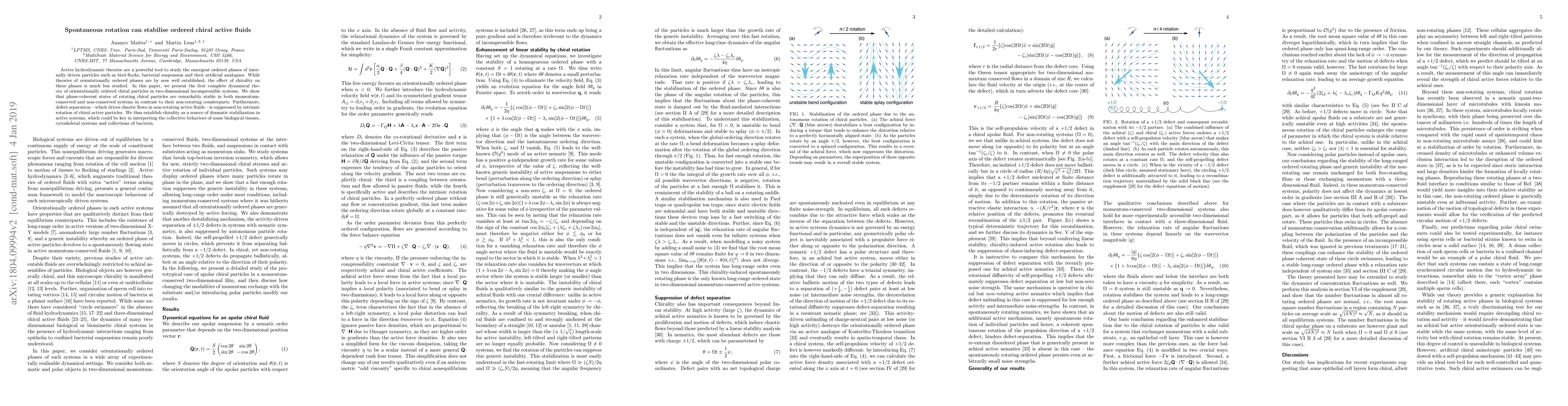 This paper develops a comprehensive dynamical theory for chiral particles in active fluids, demonstrating that spontaneous rotation significantly stabilizes ordered phases compared to non-rotating particles. The intrinsic rotation of chiral particles suppresses defect separation, providing a potential explanation for the stability seen in biological tissues and bacterial collections.